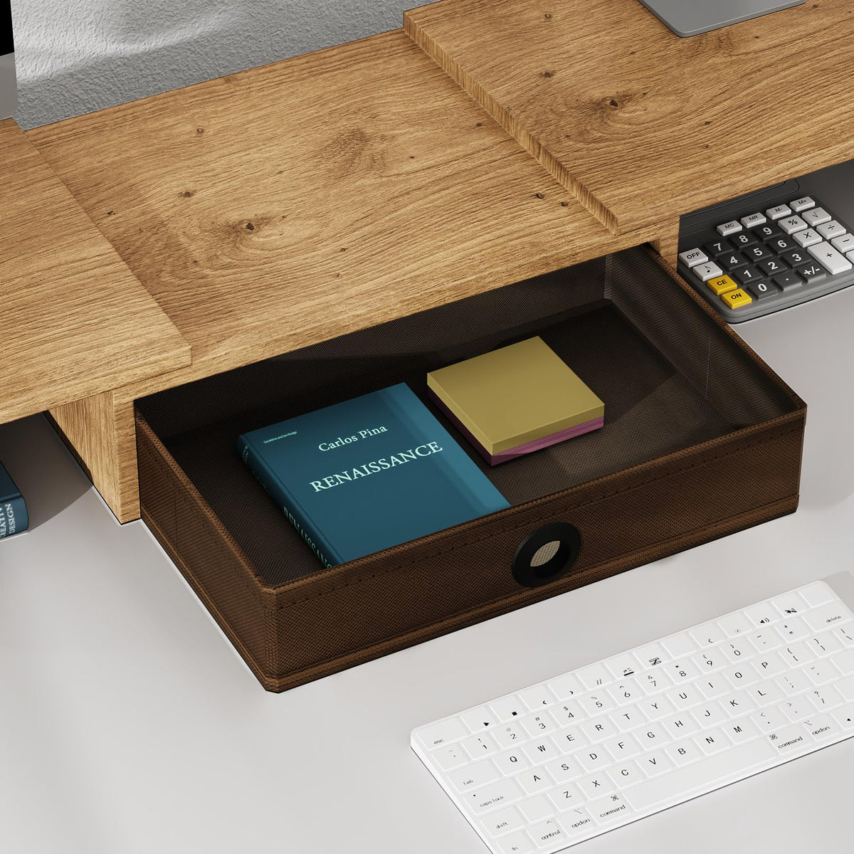 Q: What storage options does the ErgoFocus Dual Monitor Stand provide?A: This monitor stand features a built-in drawer for storing office supplies such as sticky notes and pens, along with two side pen slots, helping you keep your workspace organized and clutter-free.