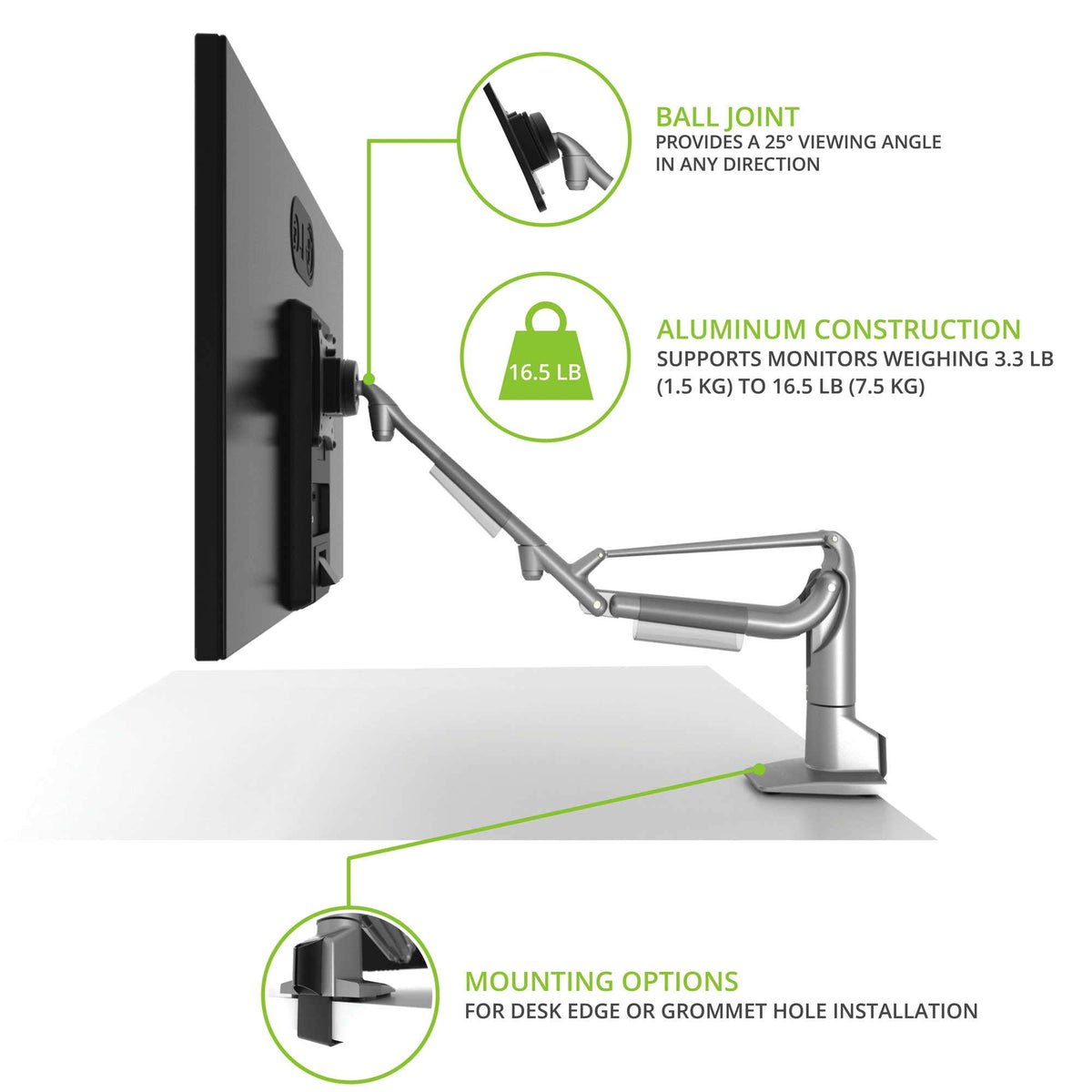 Achieving The Perfect Desktop Setup Is About Striking A Balance Between Style And Functionality. The Dms1000 Is Designed To Do Exactly That. Combining Industrial Influences With A Minimalist Design, This Gas Shock Monitor Mount Allows For Finger-Tip Adjustments To Be Made To The Height And Orientation Of Your Screen. Raise, Tilt, Swivel And Rotate Your Monitor On The Fly To Ensure It'S Always In An Ideal Position. The Detachable Base Provides A Seamless Connection To Your Desk, While Its Easy-To-Use Clamping Mechanism Can Be Secured To Any Ledge Or Grommet Hole Up To 2 Inches Thick. To Ensure A Clutter-Free Setup, The Dms1000 Also Includes Cable Management Clips To Conveniently Route Your Cables.