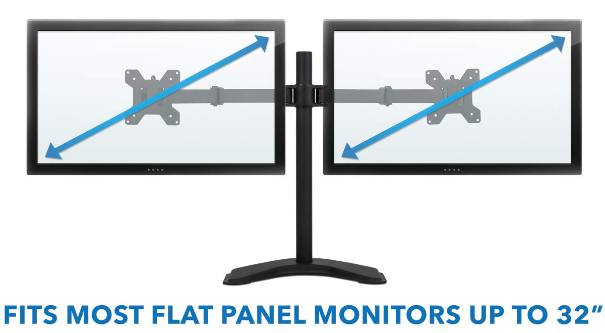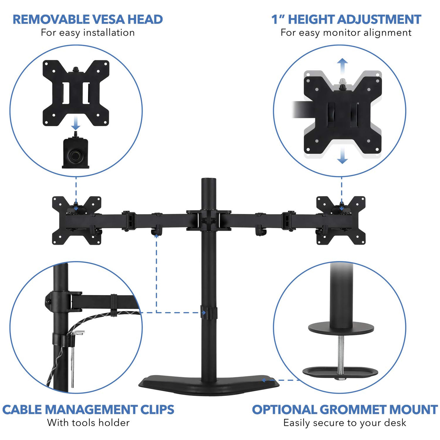 Dual Monitor Desk Free Standlooking For A Heavy Duty, Height Adjustable, Vesa Compatible Mount With Interchangeable Free Standing And Grommet Bases? Then The Mi-2781B Is Your Answer. This Vesa Compatible Desk Mount Tilts 80 Degrees Up And Down In Either Direction, And Swivels A Full 360 Degrees. You Can Adjust The Height Of The Pole A Total Of 15.5'' Inches. Monitor Can Be Rotated Into Portrait Or Landscape Orientation And Will Hold In Place.Features:15.5'' Inches Of Height Adjustmenttilts 80 Degrees Up And 80 Degrees Downboth Arms Can Swivel A Full 360 Degreesmonitor Can Be Placed And Held In Either Landscape Or Portrait Orientation Independent Of One Anotherheavy Duty Steel Construction Will Stand The Test Of Timesupports Up To 22 Pounds On Each Armblack Powder Coat Finish Is Highly Scratch Resistantfree Standing Base Allows For Quick And Convenient Placement On All Desktops - So Easy Even A Caveman Can Do It!It Also Includes All Of The Necessary Hardware Required For Quick Assembly And Comes With An Instructional Manualdouble Monitor Mount Comes With A 5-Year Warrantyfriendly, Us-Based Customer Service Department Is Available To Answer Any Questions You May Have During Normal Business Hours