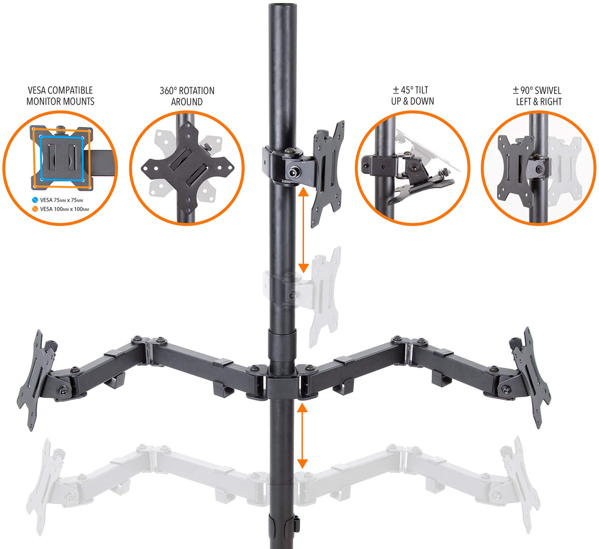 Stand Steady Clamp On 3 Monitor Stand For Desk. Achieving Your Perfect Ergonomic Posture Is Easy With The Height-Adjustable Monitor Stand Designed To Keep Your Screens At Eye Level And Your Spine Aligned. These Adjustable Steel Arms Support Multiple Monitors At Once While Ensuring They Stay Securely In Place. With Securing Vesa Mounts With 3 Points Of Adjustment, This Monitor Arm Lets You Fully Customize Your Screen Placements By Rotating, Tilting, And Turning Your Monitors To Their Ideal Viewing Positions. | Features We Love: Supports 4 Monitors, Heavy Duty Construction, Detachable Vesa Plates, Ergonomic Screen Viewing, Adjustable Computer Monitor Stand. Materials, Frame: Sturdy Steel Overlaid With A Powder-Coated Finish. Dual Monitor Arm For Standing Desk.