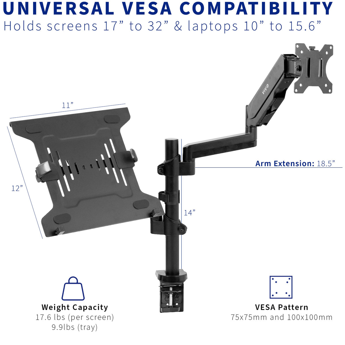 Increase Efficiency And Optimize Viewing Angles With Pneumatic Arm Single Monitor And Laptop Desk Mount (Stand-V102L) From Vivo! Win Back Valuable Desk Space By Elevating Your Monitor And Laptop To An Ideal Viewing Height With This High-Grade Steel Stand Built For Scratch Resistance And Security. Featuring Arm Articulation, Pneumatic Spring Height Adjustment, A Sturdy C-Clamp, Integrated Cable Management, And More, This Mount Is Customizable To Your Particular Office Needs. The Versatility Of Screen Placement Allows Ergonomic Viewing That Aids In Decreased Fatigue And Muscle Strain On The Neck, Back, And Shoulders. The Classy Appearance Adds A Modern Look To Any Office While Providing Ample Support For A Monitor And Laptop Combo. All Hardware Is Provided For Easy Assembly, So You Can Get Your New Stand Mounted In No Time! Compatibility: Monitor Size: 17 To 32 Laptop Size: 10 To 15.6 Vesa Standard: 75X75Mm And 100X100Mm Weight Capacity: 17.6 Lbs (Monitor), 9.9 Lbs (Laptop) Mounting Options: C-Clamp, Grommet Mount Maximum Desktop Thickness: 3 Specifications: Color: Black Material: Steel, Plastic Pole Height: 14 Maximum Monitor Extension: 18.5 Arm Span: 33.5 From Bracket To Bracket Articulation: +35 To -35 Tilt, 180 Swivel, And 360 Rotation Laptop Mount Dimensions: 12 X 11 Monitor Screen Orientation: Portrait Or Landscape