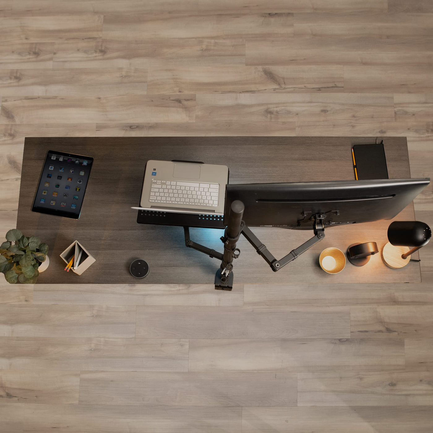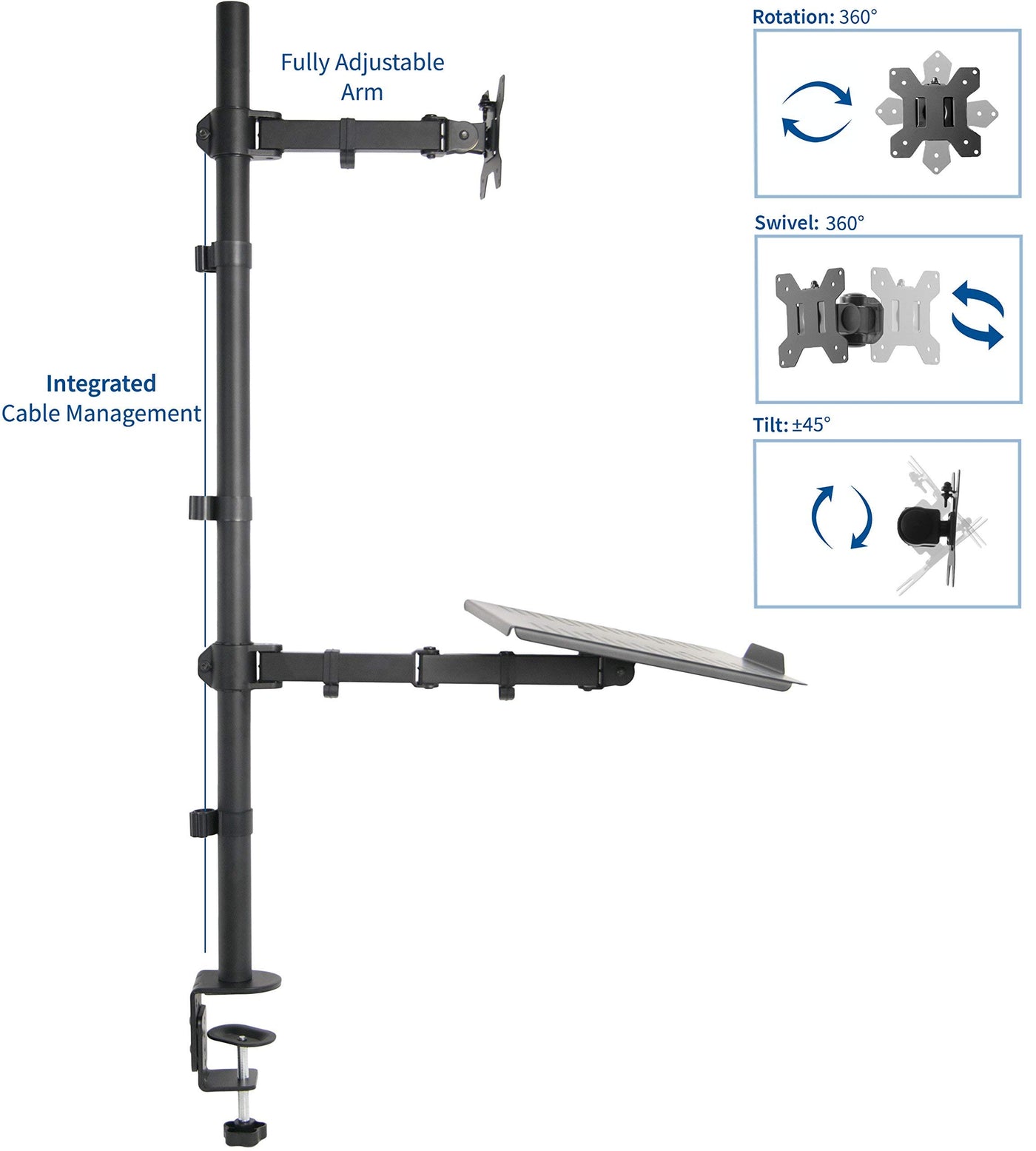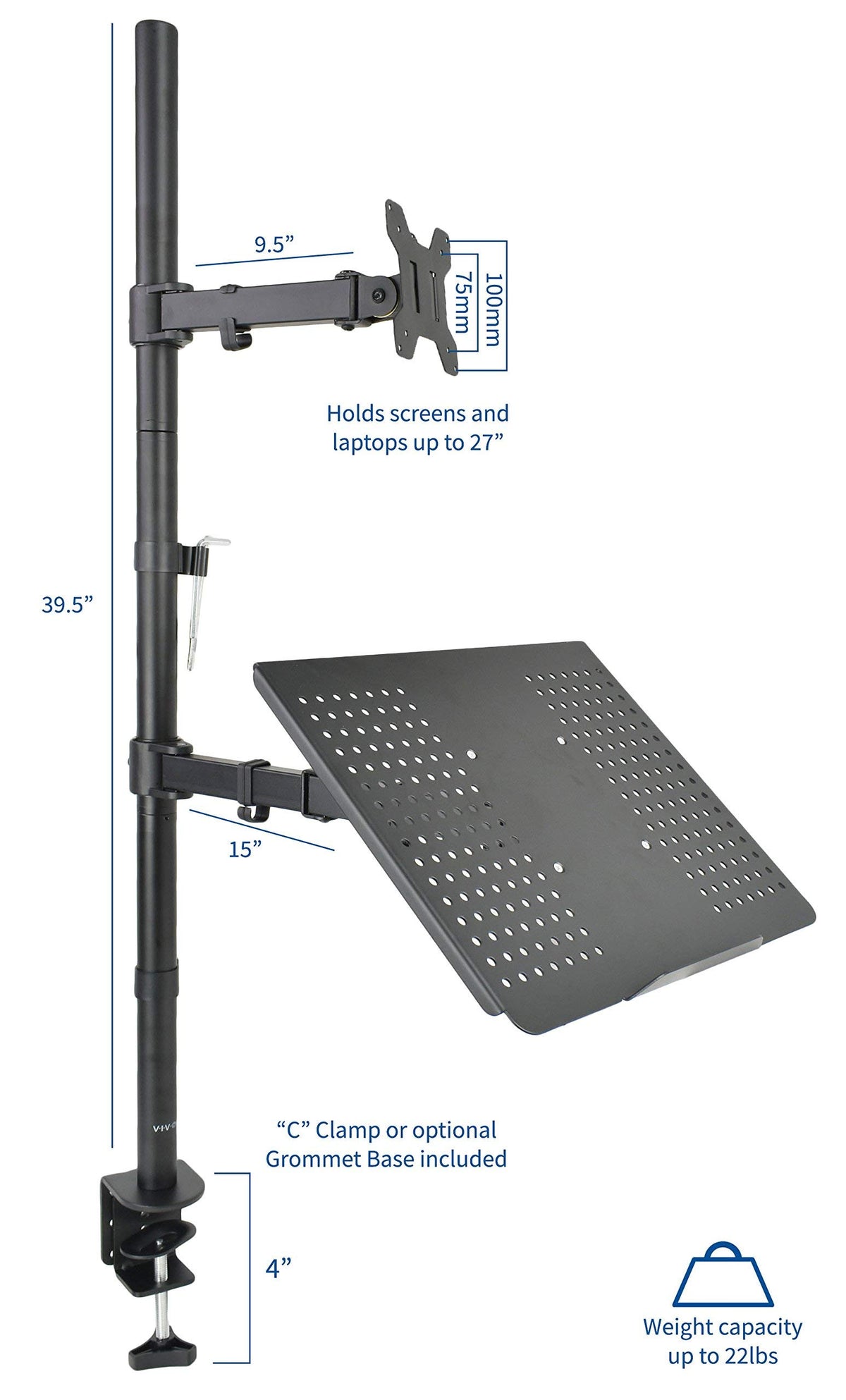 Stand-V012C From Vivo Enables You To Mount Your Laptop Along With A Monitor Up To 27'' And A 22 Lbs In Weight. Comes With An Extra Tall 39.5'' Pole Allowing The User To Adjust From Sitting And Standing Positions. This Mount Is Elegantly Designed With A Smooth Black Finish. The Lcd Mounting Bracket Uses Vesa 75X75 And 100X100 Mounting Holes, And The Laptop Base Is 12'' X 14'' With A 1/2'' Lip. Special Features Include The Ability For Each Individual Vesa Plate To Be Adjusted Up And Down By 1'' (See Pictures And Video For More Information). Every Joint Is Able To Be Tightened, So You Can Adjust Exactly How Fluid/Stationary You Want Everything. Constructed Of High Grade Steel This Rugged Mount Was Built To Resist Scratches. Included Is An Ultra-Heavy Duty ''C'' Clamp (With 4.25'' Opening) And Grommet ( With 3.5'' Opening) Mounting Option. Compatibility & Measurements This Is A Standard Vesa Mount With 75 X 75 And 100 X 100 Mounting Holes Supports Screens Up To 22 Lbs And 27'' In Size. Stand-V012C Has An Extra Tall 39.5'' Center Pole With Easy Height Adjustment. Features: Tilt: -45 To +45 Degree Swivel: 360 Degree Rotate: 360 Degree Height Adjustable Integrated Cable Management System Monitors Can Be Installed Either In Portrait Or Landscape Shape Fully Adjustable Arm Ultra Heavy Duty ''C'' Clamp(With 4.25'' Opening) And Grommet ( With 3.5'' Opening) Mounting Options