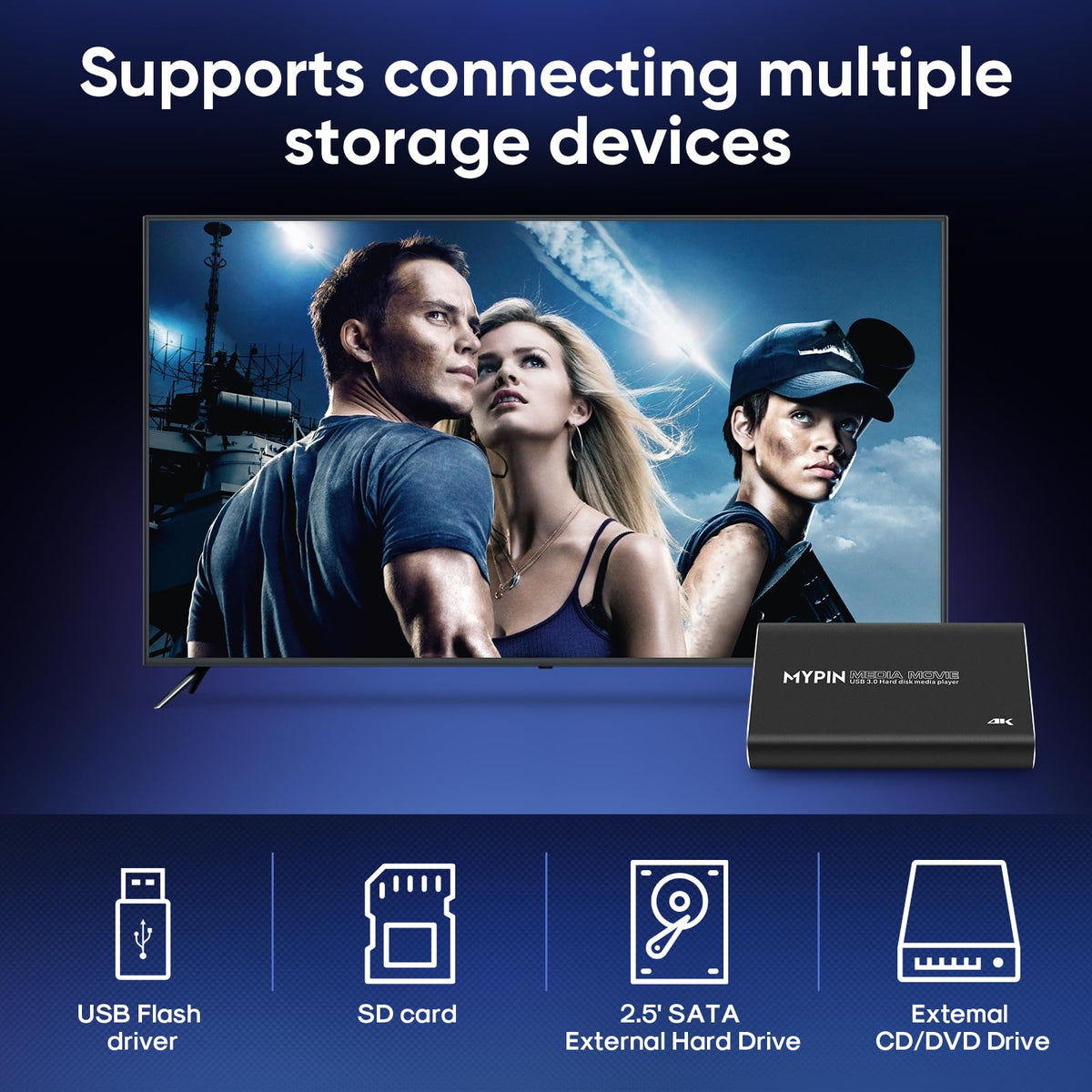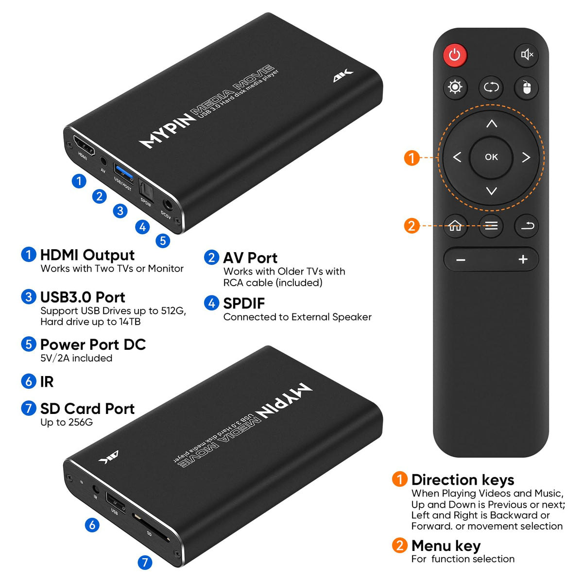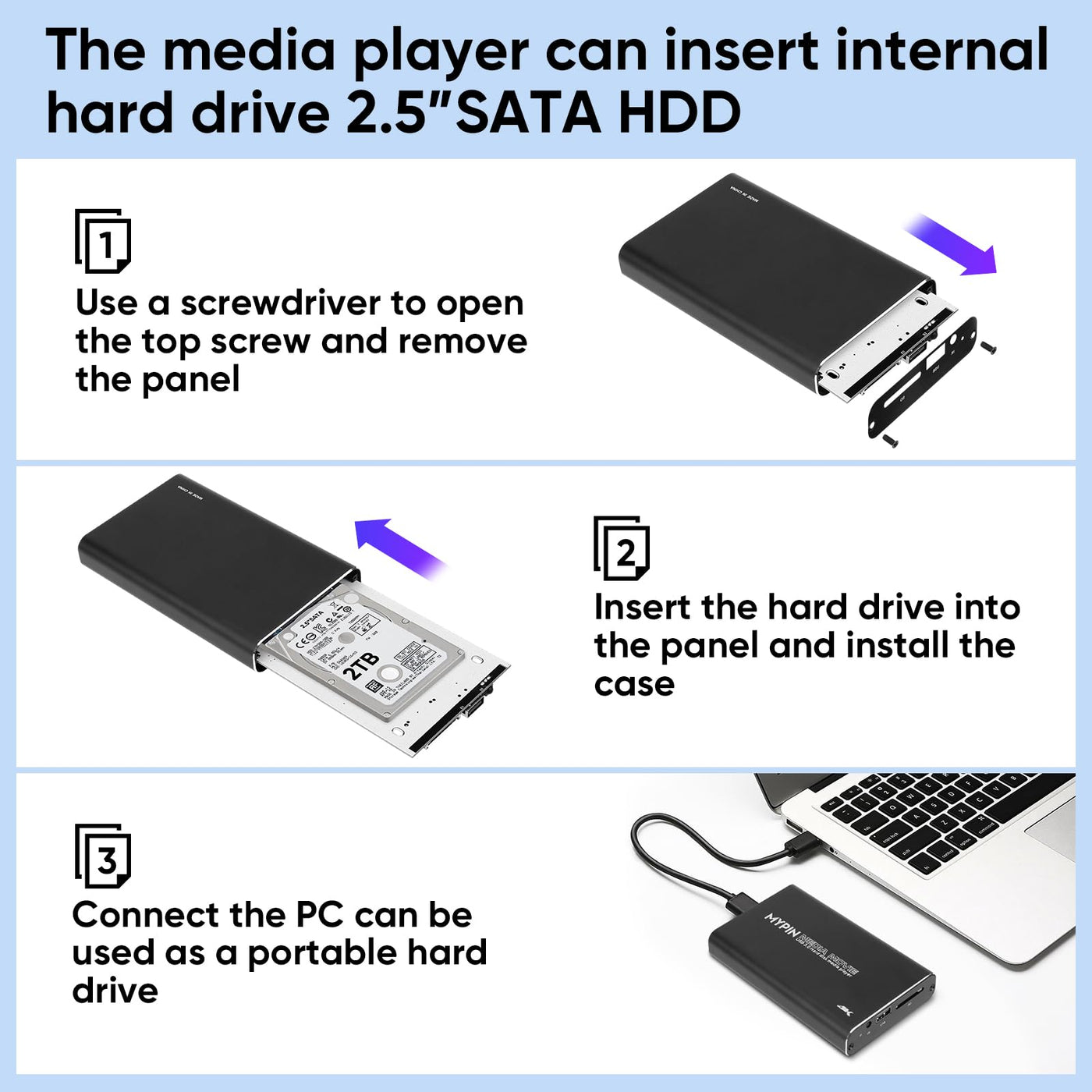 4K@30Hz Usb3.0 Hdmi Media Player Support 2.5'' Sata Hdd With Hdmi/Av/Optical Output, Portable H.265 Mp4 Player For Videos/Music/