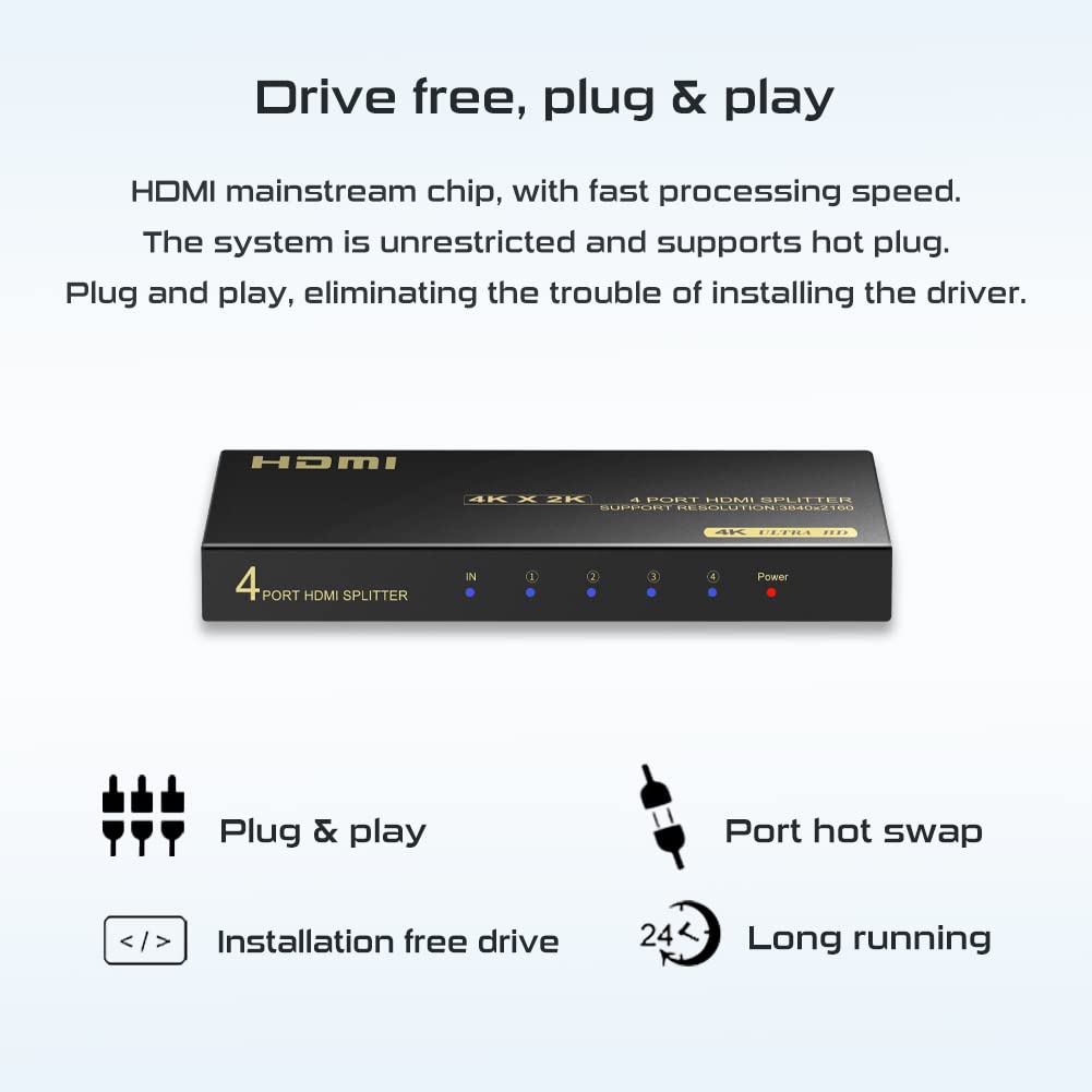 4K Hdmi Splitter 1 In 4 Out 60Hz1. 4 Way Hdmi Splitter Supports Different Resolutions, Including 4Kx2K/60Hz, 4Kx2K/30Hz, 1080P/60Hz, 1080P/30Hz.2. Hdmi Splitter 1 In 4 Out Will Distribute The Audio And Video Signals Of One Signal Source To 4 Hdmi Displays At The Same Time, Providing You With High-Quality Audio And Video Without Stuttering, Flickering, And Resolution Degradation.3. Using Awg26 Hdmi 2.0 Standard Cable, The Maximum Distance Is 15M/49Ft At The Front And 15M/49Ft At The Back, Providing You With A Transmission Distance Of 30M/98Ft.4. Adopt Imported High-Performance Combination Chip, Support Hot-Swappable, Drive-Free, Small Size, Plug And Play Installation.5. The Metal Shell Is Used To Protect The Inside, Quickly Absorb Heat And Dissipate Heat, And Ensure The Stable Operation Of The Equipment For A Long Time.6. Compatible With Hdmi Hdcp 1.4/1.3/1.2/1.1/1.0, Suitable For Most Standard Hdmi Interface Equipment.Product Parameters:Output: Hdmi*4Input: Hdmi*1Resolution: 4Kx2K/60Hz Yuv4:2:0, 4Kx2K/30Hz, 1080P/60Hz, 1080P/30Hzmaterial: Iron Shellsize: 13.6Cmx6Cmx1.6Cmaccessories: 1Xhost, 1X5V/1A Power Adapter, 1Xproduct Manual