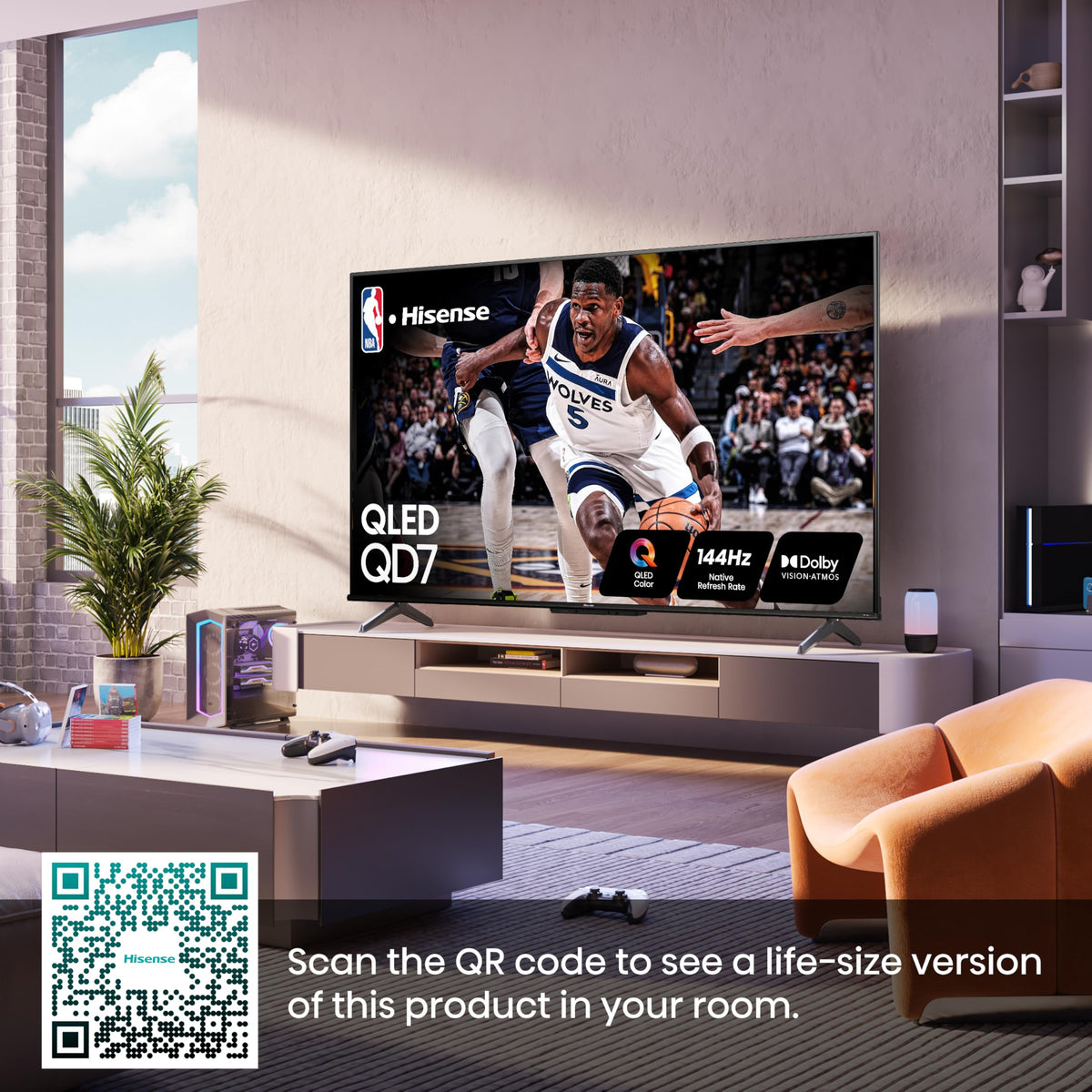 Q: What audio technologies does the Hisense QD7 Series offer?A: The Hisense QD7 Series TV is equipped with Dolby Vision HDR for stunning visuals and Dolby Atmos technology for immersive sound, making it ideal for enjoying movies and gaming with cinematic audio quality.