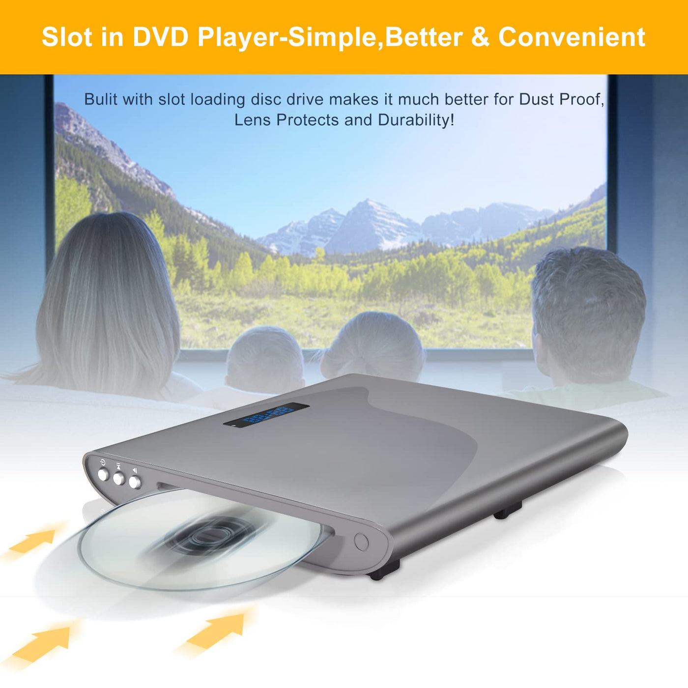 Q: What features make the Famishow DVD player user-friendly?A: The Famishow DVD player includes a slot-in loading disc drive for easy disc insertion, an upgraded remote control for precise operation, and advanced functions like error correction, last memory playback, and a built-in USB 2.0 port for direct media playback.