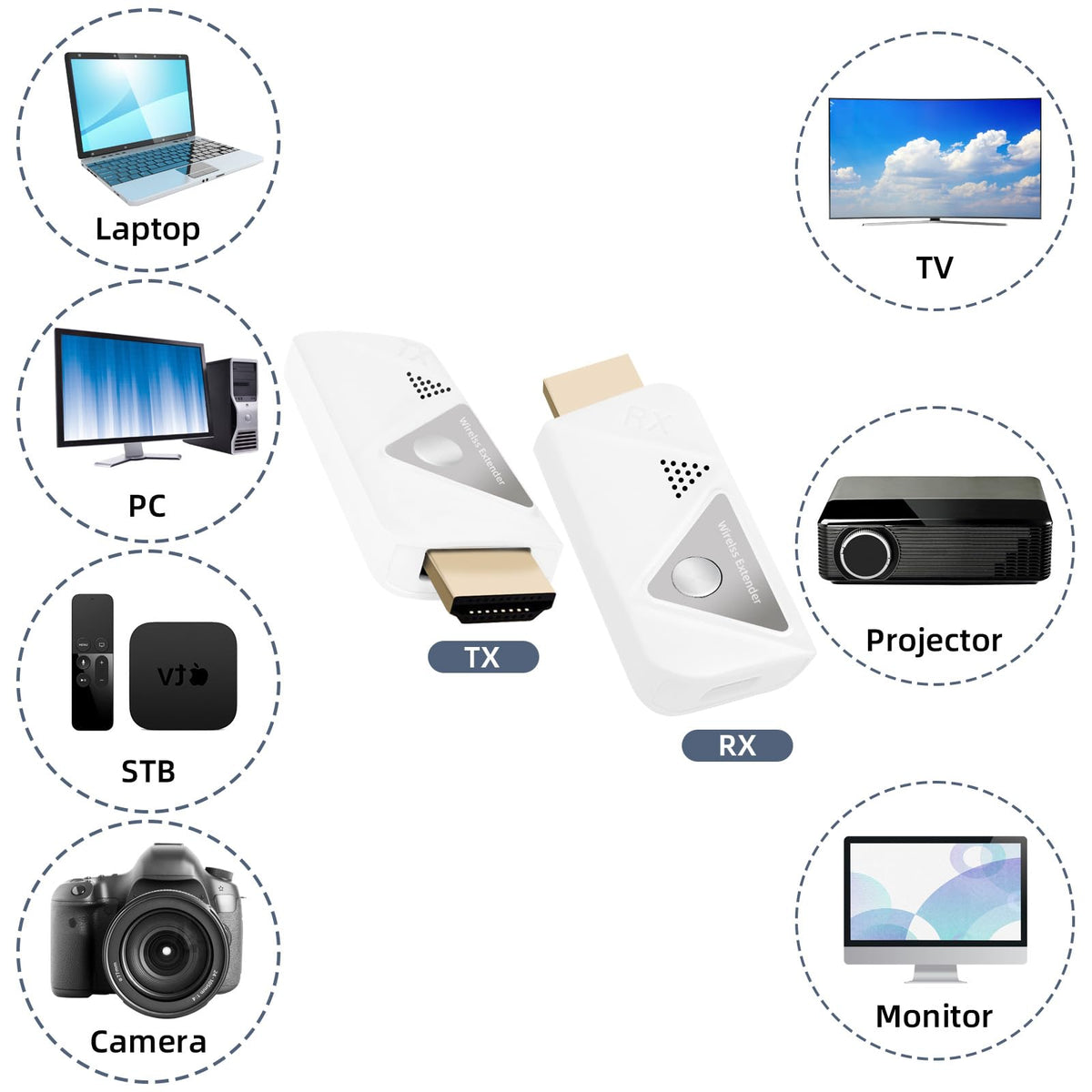 Q: What devices are compatible with the SUNMEG Wireless HDMI Transmitter and Receiver?A: The SUNMEG Wireless HDMI Transmitter can be connected to devices such as laptops, PCs, set-top boxes (STB), and cameras. The Receiver is compatible with TVs, projectors, and monitors, making it ideal for business meetings, gaming, and home theater setups.
