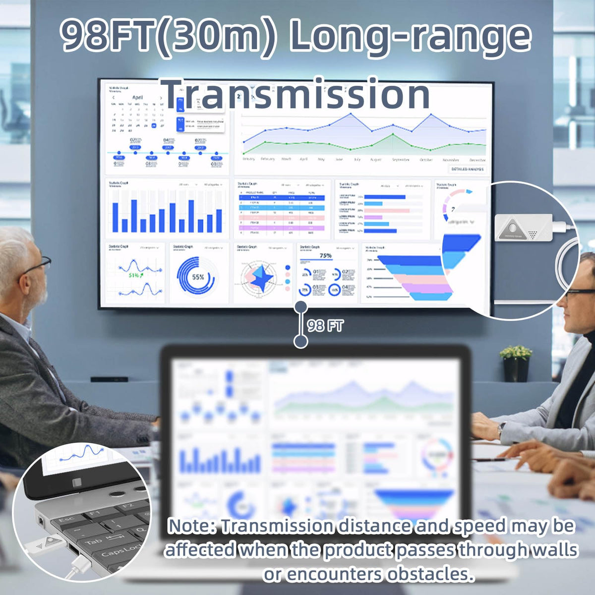 Q: What is the maximum transmission distance for the Wireless HDMI kit?A: The SUNMEG Wireless HDMI Transmitter and Receiver can transmit up to 98 feet (30 meters) using 2.4G/5G transmission protocols. However, the effective range may be reduced if there are walls or obstacles between the transmitter and receiver.