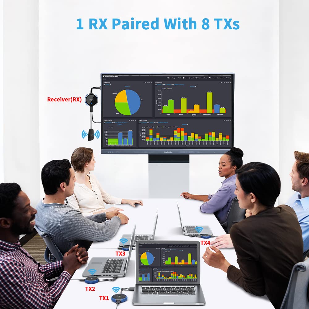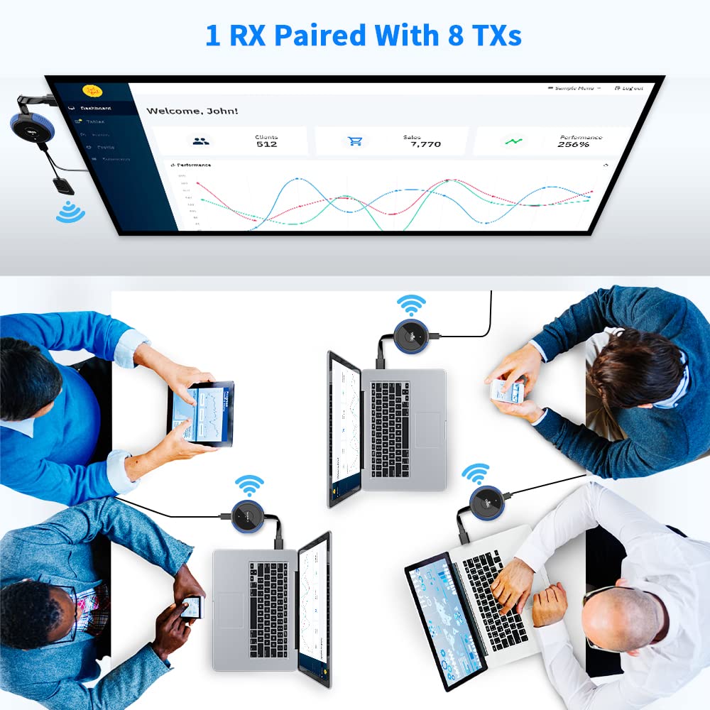 Q: Can I connect multiple transmitters to the TIMBOOTECH HDMI Wireless Receiver?A: Yes, the TIMBOOTECH HDMI Wireless Receiver can be paired with up to 8 transmitters. Each transmitter needs to be paired with the receiver before use, and switching between them is easy with just a click of the respective transmitter's middle button.