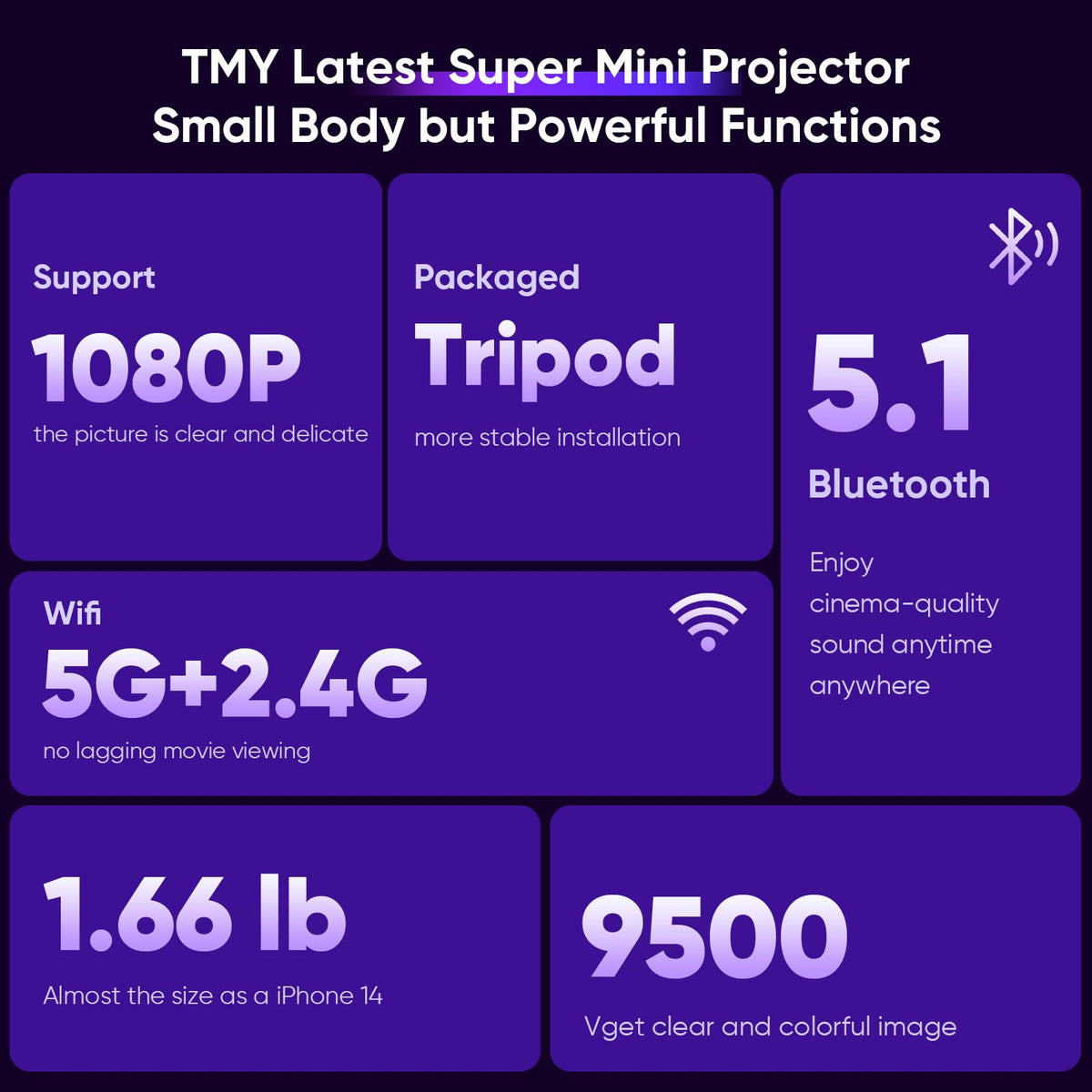 Tmy Mini Projector For Iphone, Portable Projector With Wifi And Bluetooth, 1080P Hd Projector?With Tripod?, 9500L Movie Projector For Ios/Android/Windows/Tv Stick/Hdmi/Av/Usb, Indoor & Outdoor Use