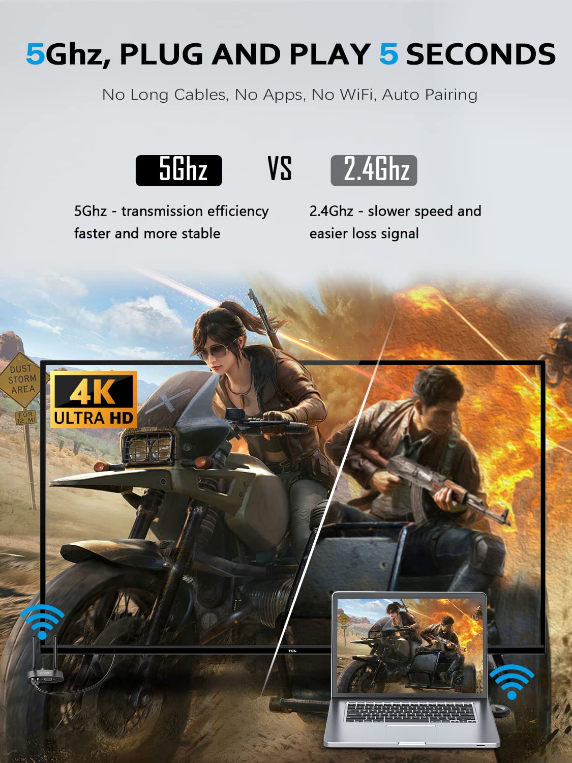 Q: How do I set up the Wireless HDMI Transmitter and Receiver?A: Setting up the Wireless HDMI Transmitter and Receiver is quick and easy. Simply plug the transmitter into your HDMI or USB-C device and the receiver into your TV or projector. Power them on and wait about 5 seconds for automatic synchronization. No additional apps or settings are required.