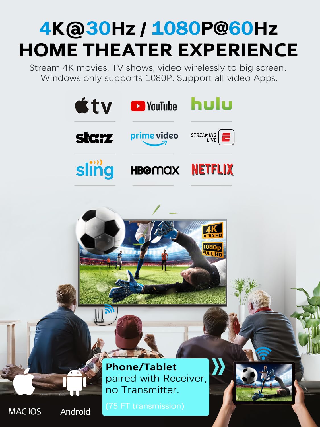 Q: What resolution does the Wireless HDMI kit support?A: The Wireless HDMI Transmitter and Receiver supports resolutions of 720p, 1080p, and 4K, providing a high-quality home theater experience. This makes it suitable for streaming HD content from popular platforms like YouTube, Netflix, and Hulu.