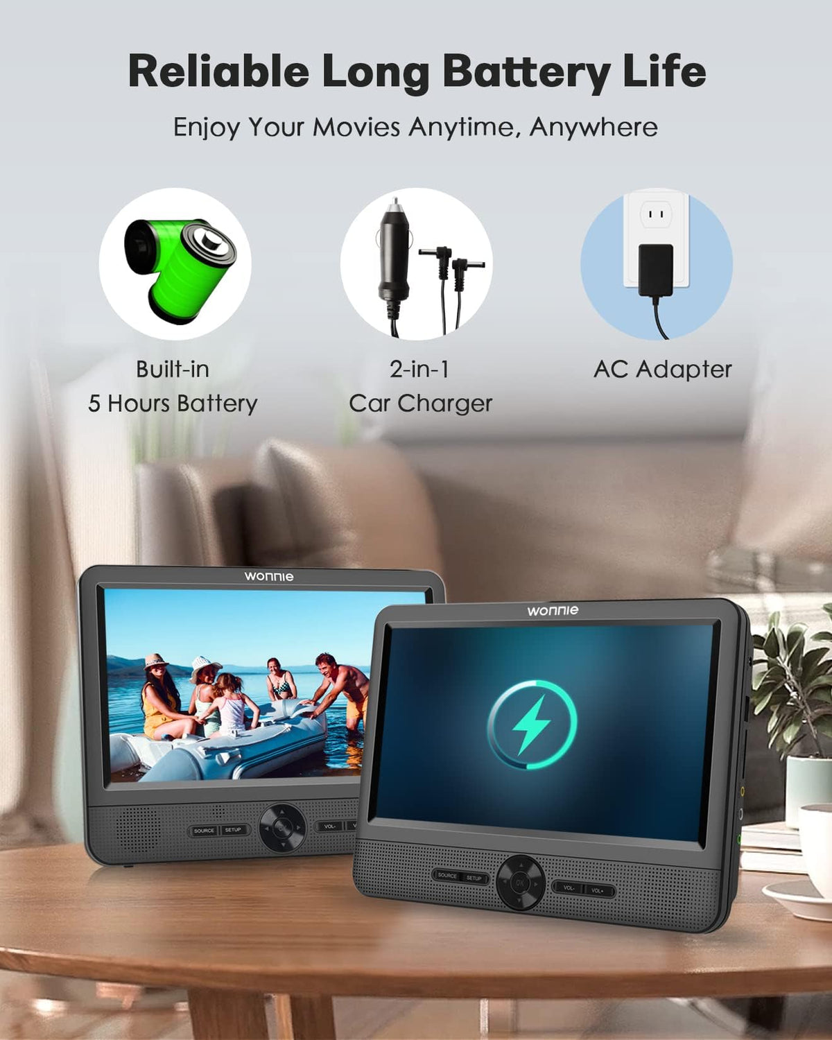 Q: How long does the battery last on the WONNIE 10" Car DVD Players?A: The WONNIE 10" Car DVD Players have a built-in high-capacity rechargeable battery that supports up to 5 hours of playback time. This allows for extended viewing during long road trips without needing to be plugged in.