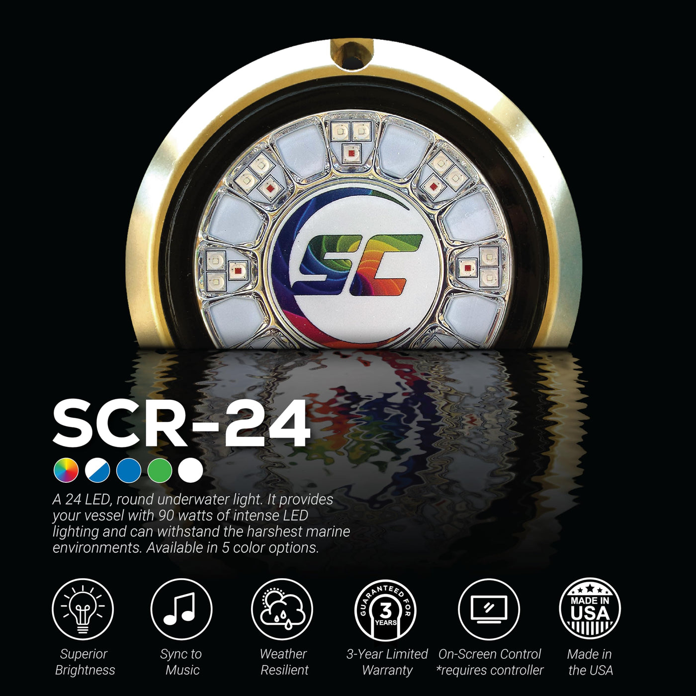 Scr-24 Bronze Underwater Light - 24 Leds - Full Color Changingthe Scr Series Underwater Led Lights Are Designed To Be Marine Vessel Hull Mounted For Continuous Submersion In Sea Water. These Models Off A Great Value And Small 4 Diameter To Fit Many Locations. Multiple Brightness Options Are Available As Well As Single Or Multi-Color.High Intensityshadow-Caster Underwater Led Lights Are Designed To Deliver The Most Intense Optical Output. Our Unique Design Allows Us To Produce Maximum Light Output And Maximum Led Life (Over 40,000 Hours).Robust Designwith Shadow-Caster Underwater Led Lights, Theres No Additional External Components To Install. Just Connect The Cable (Submersible To 20 Feet). All The Necessary Electronics Are Integrated Into The Housing And Resistant To Vibration And The Elements.Surface Mountedour Lighting Solutions Feature A Low Profile Design That Requires No Alteration To The Main Hullwide Input Voltage Rangeshadow-Casters Underwater Led Lights Have An Input Range Of 10 To 30 Volts And Work Equally Well On Sets Of 12 Or 24 Volts.Surge And Reverse Polarity Protectionour Lighting Systems Have An Innovative Protection System That Automatically Disconnects The Input Entry When Excessive Voltage Or Reverse Polarity Is Detected.Thermal Protectionour Unique Thermal Protection Features A Control System That Detects Internal Temperature And Adjusts Energy Production Down To Avoid Damage.Features:90 Watts (7.5 Amps @12 Volts)4 Outside Diameterbronze Housingscratch-Resistant Glass Lenssurge And Reverse Polarity Protectionthermal Throttling ( C ) Above Water Protectionshadow-Net Enabledincludes 10 Submersible Cord & Insta