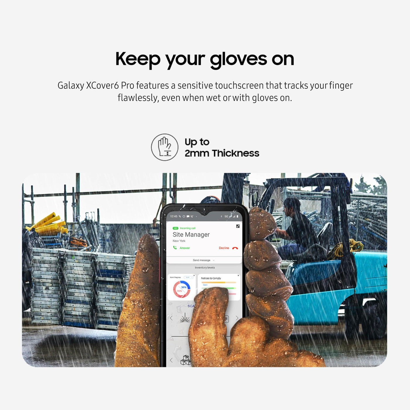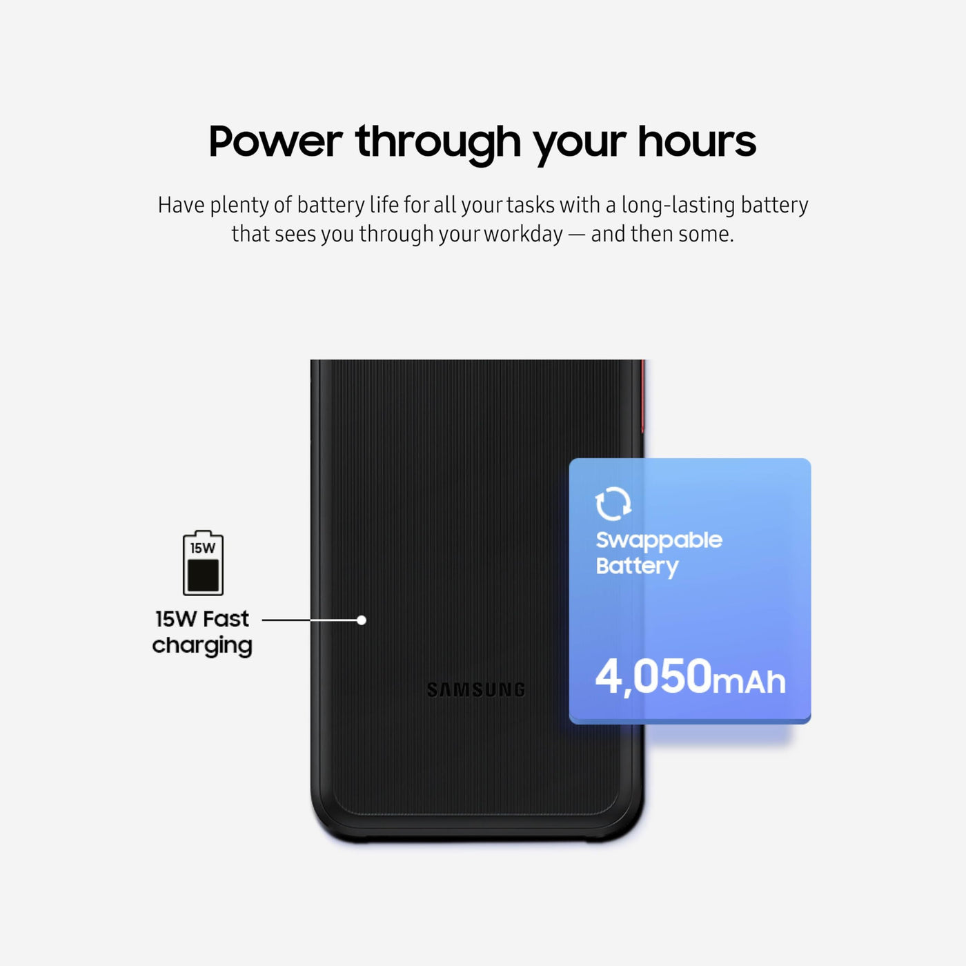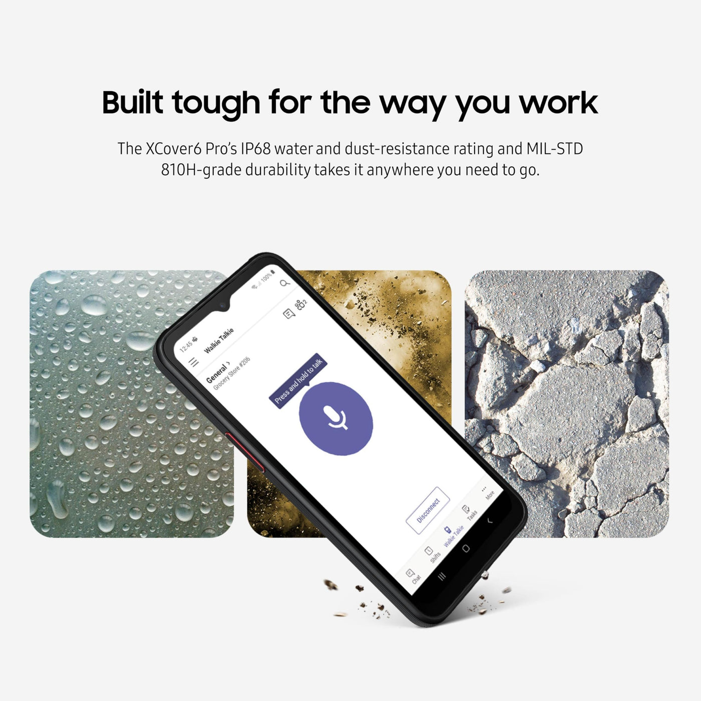 Give Your Frontline Team A Phone Thats More Than Up For The Job With Galaxy Xcover6 Pro. For Field Workers And Those In Environments Like Delivery Services, Warehouses, Law Enforcement And More, Xcover6 Pro Helps Workers Do More With Less While Staying Productive On Their Feet. A Durable And Water-Resistant Design Withstands Drops And Spills, And A Moisture-Resistant Screen Lets You Work Even With Wet Gloves On. Keep Things Moving With A Long-Lasting Battery That Keeps The Workflow Going. Its Also Replaceable - Simply Swap It For A Fresh Battery And Continue On. Customizable Features Such As Hot Keys Empower Your Workers By Letting Them Turn The Smart Phone Into A Scanner Or A Walkie Talkie. Plus, Your Employees Will Have Peace Of Mind Because Xcover6 Pro Is Part Of A Rich System Of Partner Software And Hardware Integrations You Already Know And Respect. Youll Experience Peace Of Mind Knowing Xcover6 Pro Is Designed With The Built-In Protection Of Knox Security To Help Keep Your Businesss Data Away From Prying Eyes. These Devices Passed Military Specification (Mil-Std-810H) Testing Against A Subset Of 21 Specific Environmental Conditions, Including Temperature, Dust, Shock/Vibration, And Low Pressure/High Altitude. Real World Usage Varies From The Specific Environmental Conditions Used In Mil-Std-810H Testing. Samsung Does Not Guarantee Device Performance In All Extreme Conditions. 1.5M Drop Is Only Tested With Case On, Without Case The Device Itself Can Withstand A Drop From 1.2M. Water Resistant In Up To 5 Feet Of Water For Up To 30 Minutes. Rinse Residue/Dry After Wet. 45G Ultra Wideband Available In Select Areas. 5G Nationwide Available In 2700+ Cities. 5Wi-Fi 6E Availability May Vary Due To Os Version, Location, Network Conditions, And Other Factors. 6Based On Average Battery Life Under Typical Usage Conditions. Average Expected Performance Based On Typical Use. Actual Battery Life Depends On Factors Such As Network, Features Selected, Frequency Of Calls, And Voice, Data, And Other Application-Usage Patterns. Results May Vary. 7Implementing Android Work Profile Requires Use Of A Supporting Enterprise Mobility Management Solution.