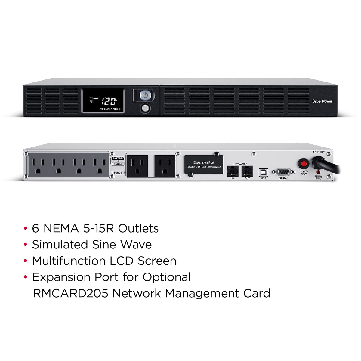 A Rackmount Ups With Line Interactive Topology, The Cyberpower Smart App Lcd Or1500Lcdrm1U Provides Battery Backup (Using Simulated Sine Wave Output) And Surge Protection For Department Servers, Workgroup Servers, Workstations, Network Devices, And Telecom Installations Without Active Pfc Power Supplies The Or1500Lcdrm1U Uses Automatic Voltage Regulation (Avr) To Correct Minor Power Fluctuations Without Switching To Battery Power, Which Extends Battery Life Avr Is Essential In Areas Where Power Fluctuations Occur Frequently This Model Accepts The Rmcard205 Network Management Card For Remote Management And Control Via A Standard Web Browser Or Network Management System The Or1500Lcdrm1U Comes With A Three-Year Warranty And A $300,000 Connected Equipment Guarantee