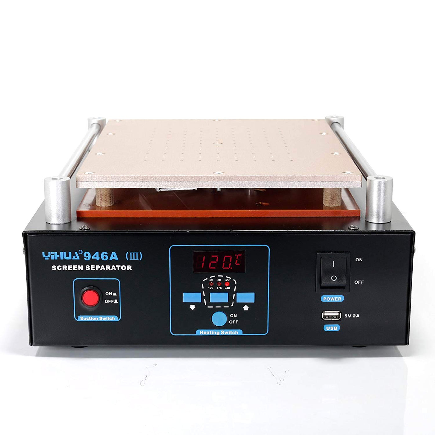 Fully Digital Lcd Screen Separator With Built-In Durable Vacuum Pump (For Applications On Mobile Phones Or Ipad). Digitally Controlled By A Zilog Dual Core Microcomputer Processor And Powered By Pid Heat Control Technology, The Advanced Precision Program. With Them, This Unit Offers Rapid Warming-Up, Very Accurate Temperature Control, Stability, Durability And Reliability. It Is Made By An Iso 9001-2008 Certified Manufacturer With 2 Decades Of Experience Of Soldering & Reworking Tools. What'S In The Box? 1 X Yh-946A-Iii Screen Separator Machine 1 X Rubber Mat 1 X Cutting Wire 1 X Usa Power Code Documentation Specifications Size Information Aluminum Panel Size: 28Cm X22Cm (11'' X 8.7'' 0.05) Rubber Mat Size: 210Mm*160Mm/8.27''X6.30'' Product Dimensions: 360Mm*288Mm*90Mm/14.17''X11.34''X3.54'' Settings Temperature Range: 122F ~248F / 50C~120C Power Powered By Zilog Dual Core Microcomputer Processor Total Power Consumption: 900 Watts Vacuum Pump Power: 12W Vacuum Pressure: 0.05Mpa Operation Requirements Operating Ambient Environment: 32F ~ 104F/ 0C ~ 40C Voltage: 110V~127V/Ac, 60Hz With Usa Plug Others: Usb Output: 5V, 2A Temperature Stability: 3.6F (In Static State) Aluminum To Ground Resistance: