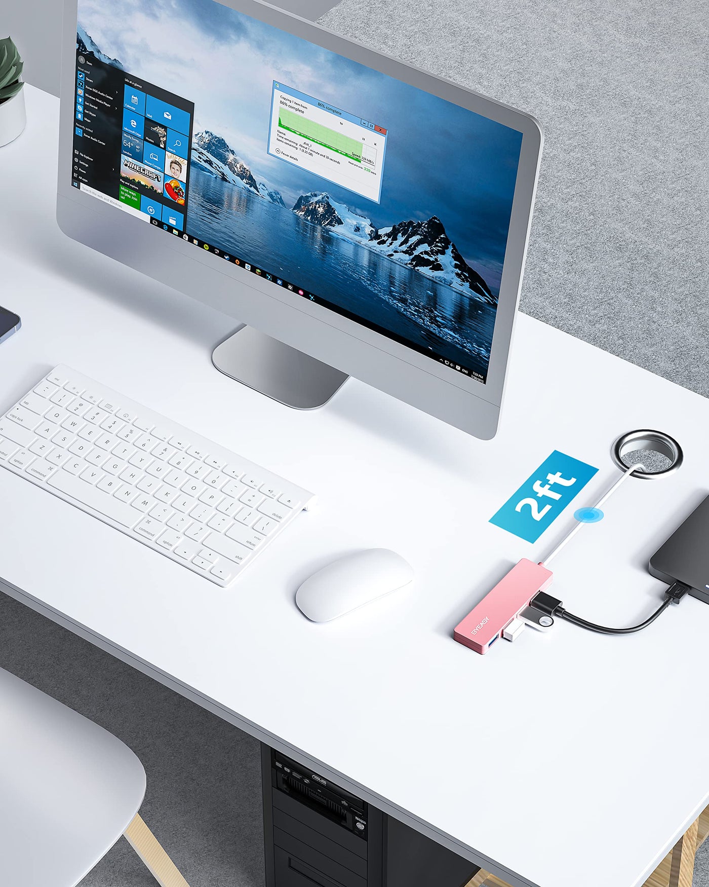 Byeasy Usb Hub, Usb 3.1 C To Usb 3.0 Hub With 4 Ports And 2Ft Extended Cable, Ultra Slim Portable Usb Splitter For Macbook, Mac Pro/Mini, Imac, Ps4, Ps5, Surface Pro, Flash Drive, Samsung(Pink)