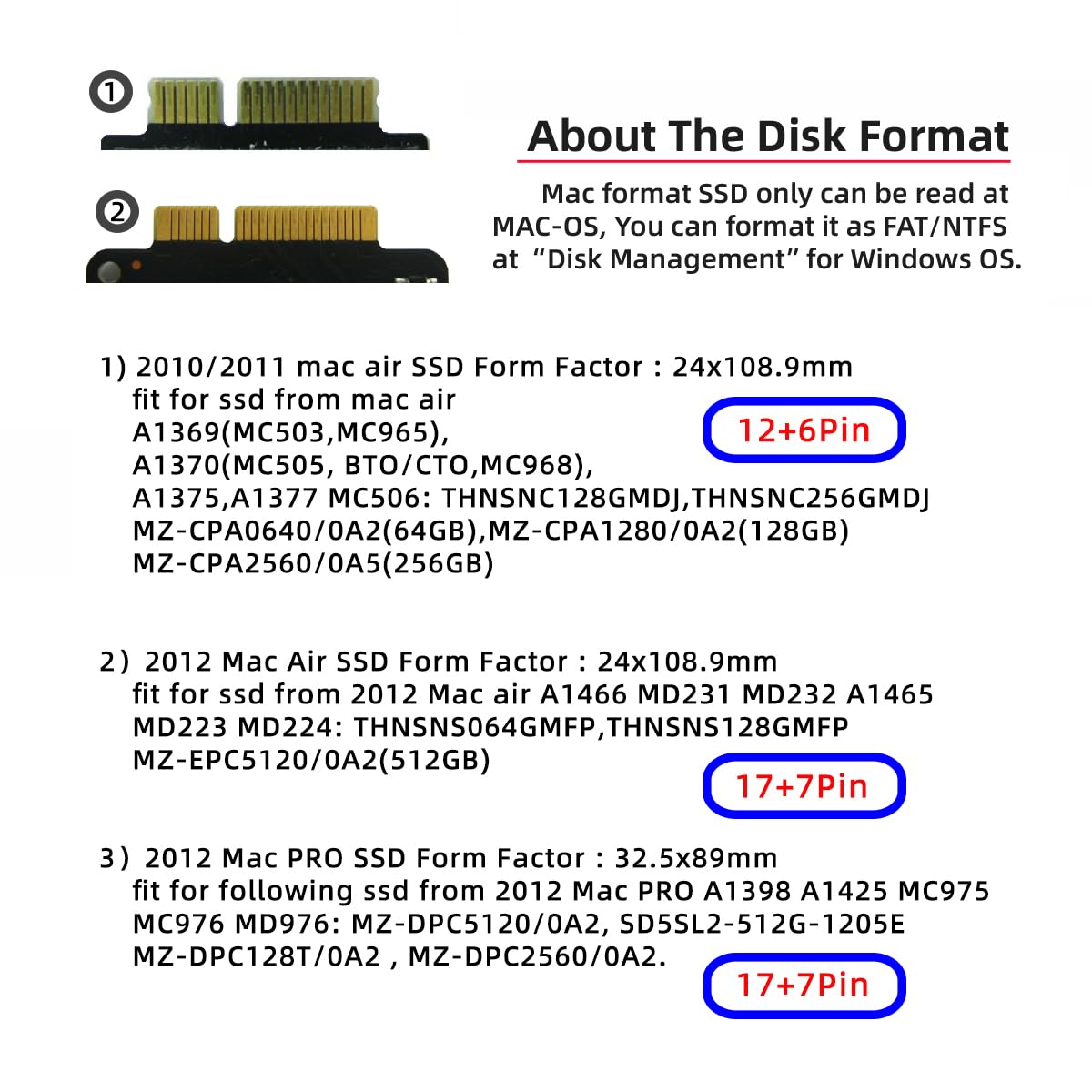 The Ssd Is Not Included In The Package. The 12+6Pin And 17+7Pin Ssd Can T Work At Same Time. You Need Use The Switch To Convert It. Sata To Mac Storage Adapter, Providing One 7+15Pin Connector On The Host Connection And Two 12+6Pin And 17+7Pin Connector On The Ssd Storage Devices Connections. When Assembled, It Can Operate In A Variety Of Operating Systems. About The Disk Format: Mac Format Ssd Only Can Be Read At Mac-Os, You Can Format It As Fat/Ntfs At Disk Management For Windows Os. Can Work For All 12+6Pin And 17+7Pin Ssd.(From 2011 To 2013 Early Mac Ssd)