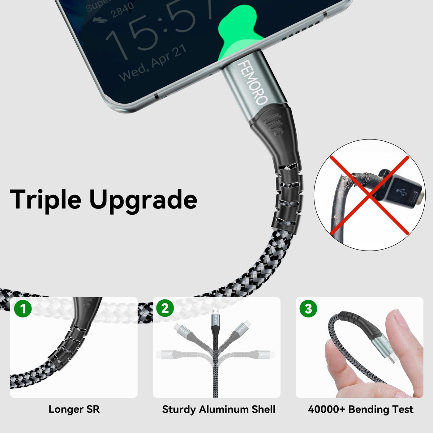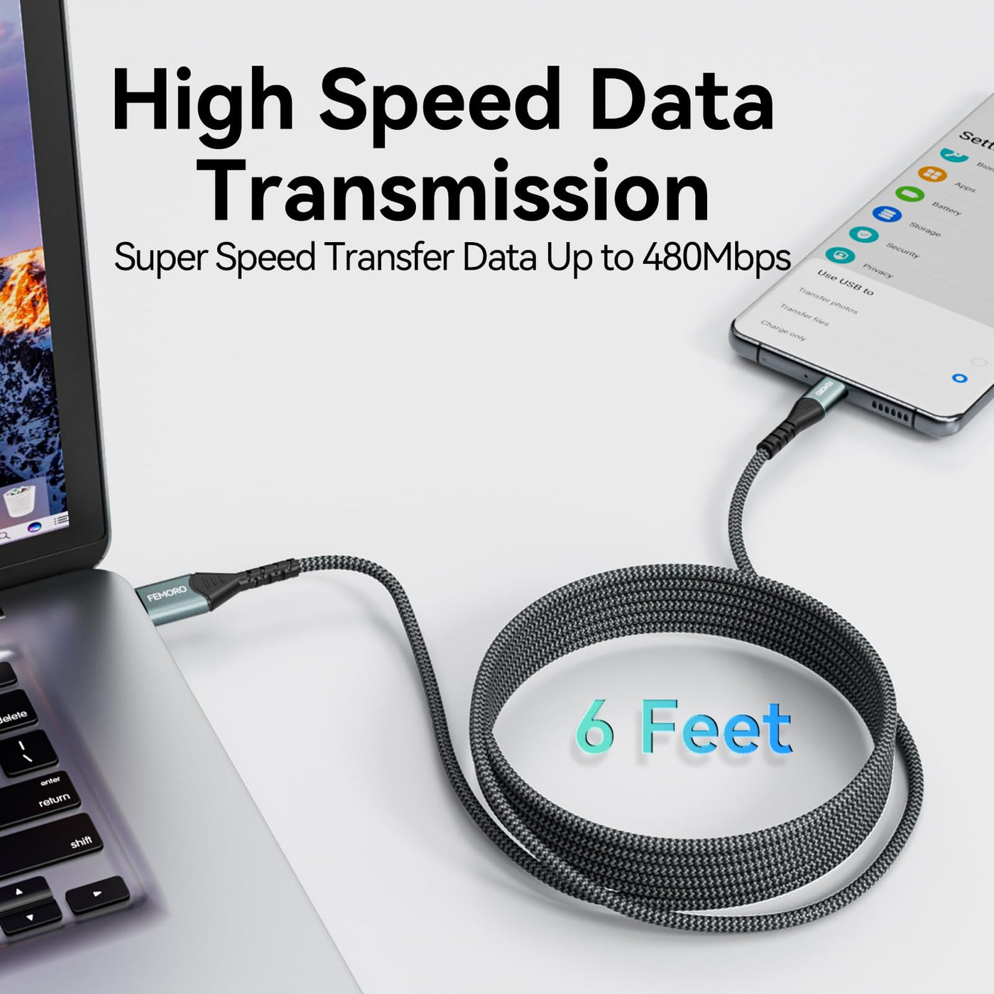 Femoro Micro Usb Cable 6Ft 480Mbps Data Transfer & 12W Charging