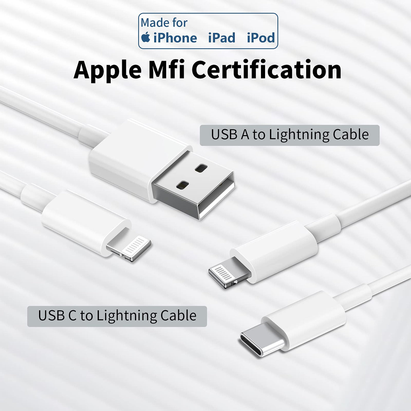 Specification:Input: Ac 100-240V 50/60Hz, 0.6Ausb-A Output: Output: 5V/3A, 9V/2A, 12V/1.5Ausb-C Output: Output: 5V/3A, 9V/2A, 9V/2.22A, 12V/1.5A20W Pd Wall Chargermaterial: Fireproof Plastic, Apple Mfi Certified Chiplightning Cable Material: Tpe Flexible Cord Carbon + 100% Coppery Corecolor/ Length: White/ 6.6Ft/ 2Mconnector Type: Pd3.0 Usb-C / Qc3.0 Usb-A Pick Us:? Each Iphone Charger Cable Contains An Apple-Issued Authorization Chip That Ensures The Cable Is 100% Compatible With The Latest Ios Version Of Apple Devices.? The Apple Mfi Cable Comes With Surge Protection And Other Advanced Safety Features To Keep You And Your Devices Safe.? Smart Ic Technology:Ul/Etl/Ce/Fcc Certified Charger Ensures Safety And Stability.Built-In Intelligent Protocol Ic Chip, Battery Protector And Automatic Chip Recognition Functions Protect Your Iphone/Ipad/Airpods Well From Damages, Ensuring Faster Charging While Also Protecting Battery Life.Compatibilityiphone Modelsiphone 14, 14 Max, 14 Pro, 14 Pro Maxiphone 13 Mini, 13, 13 Pro, 13 Pro Maxiphone 12 Mini, 12, 12 Pro, 12 Pro Maxiphone 11, 11 Pro, 11 Pro Maxiphone Se (2Nd Generation)Iphone Xs Xs Max Xr Xiphone 8 8 Plusiphone 7 7 Plusiphone 6S 6S Plusiphone Se (1St Generation)Iphone 5S 5 5C (1St Generation)Airpods Proipad Modelsipad Pro 12.9-Inch (2Nd Generation) (1St Generation)Ipad Pro 10.5-Inchipad Pro 9.7-Inchipad Air (3Rd Generation)Ipad Air 2Ipad Mini (5Th/4Th Generation)Ipad (9Th/ 8Th/ 7Th/ 6Th/ 5Th Generation)Whats In The Package ??? 1 * Wall Charger And 2-Pack Lightning Cable? 36 Months Of Free Returns And Lifetime Effective Technical Support.
