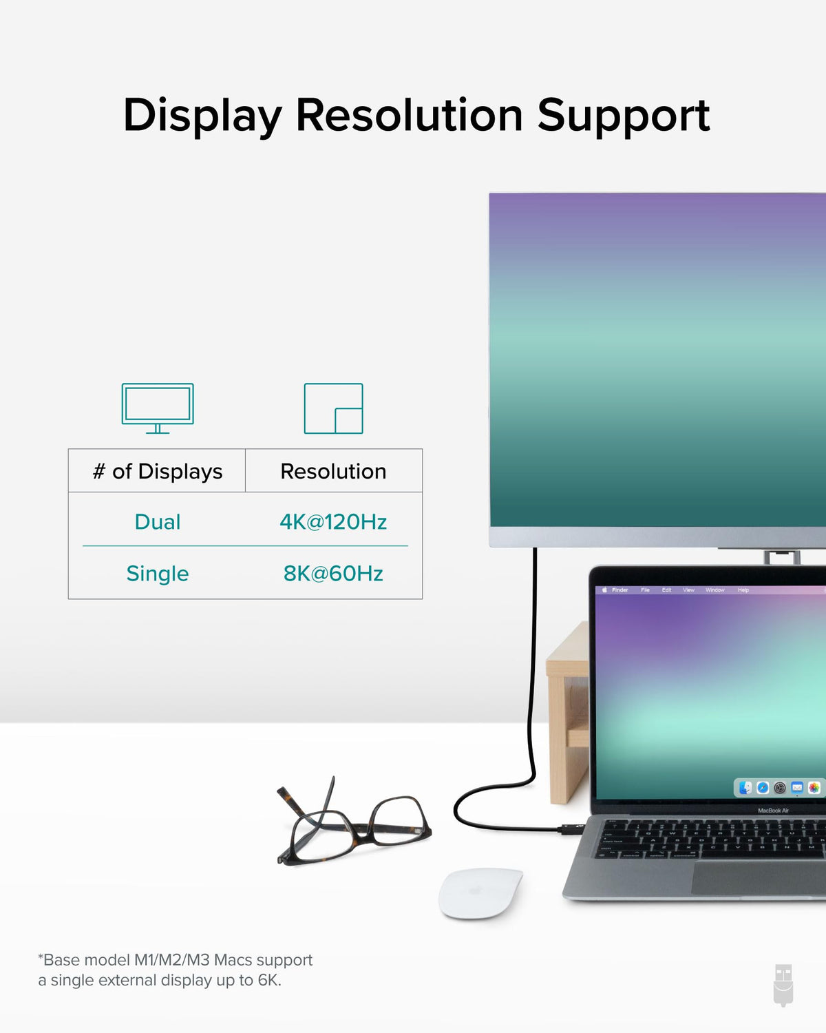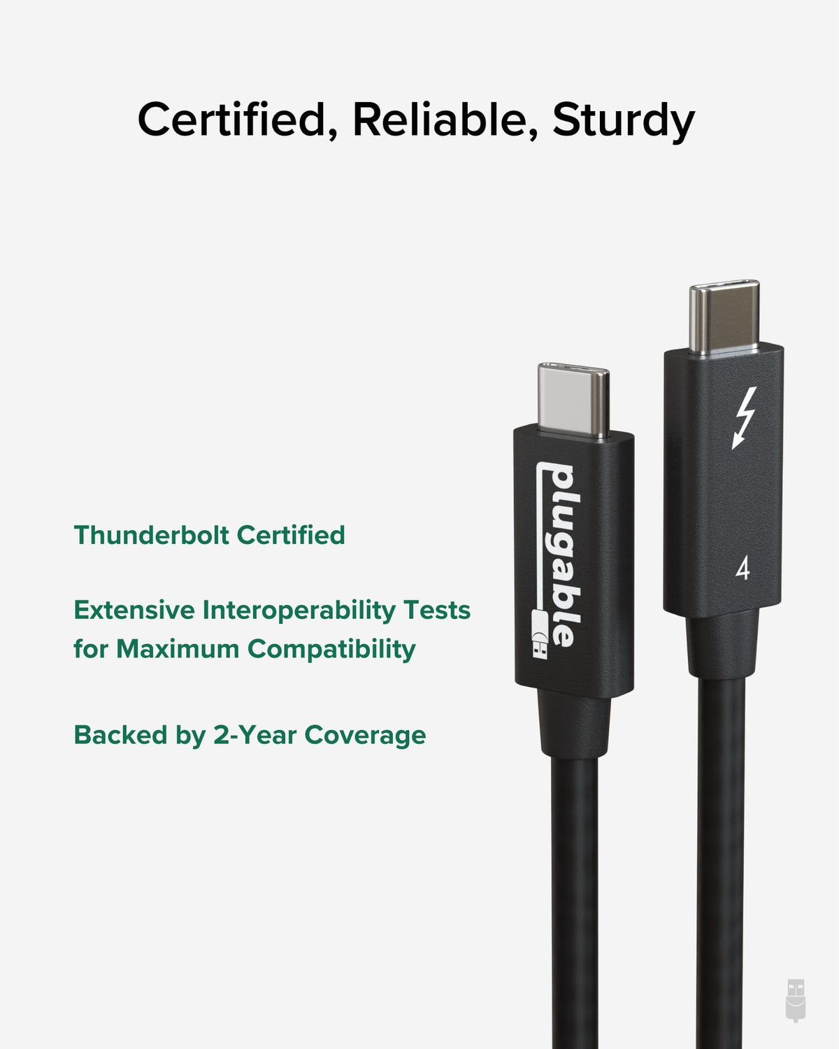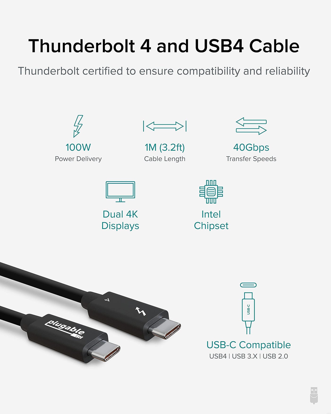 Certified Reliability: The Plugable 1M (3.3Ft) Thunderbolt 4 And Usb4 Cable Is Thunderbolt Certified To Ensure 100W 20V/5A Power Delivery, 40Gbps Data Transfer Speeds, And Support For Two 4K Screens Or One 8K Screen | Compatibility: This Certified Thunderbolt 4 Cable Is Fully Compatible With Thunderbolt 3, Usb4, Usb C, Usb 3.X/2.X/1.X, Offering Exceptional Versatility | Display And Resolution Support: Enjoy Dual 4K Screens At 120Hz Or One 8K Screen At 60Hz With The Appropriate Hub Or Docking Station; Macos Supports Up To 4K At 60Hz, And Base Model M1, M2, And M3 Macbooks Support A Single External Display, Making It Ideal For A Usb C Monitor Cable | Certified And Scrutinized: Designed And Built To Plugables Highest Standards, Rigorously Tested In Various Environments And Scenarios, Ensuring Compatibility With Almost Any Usb-C Port | Enhance Your Display Setup: Elevate Your Viewing Experience With The Plugable Thunderbolt 4 And Usb4 Cable, Offering Unparalleled Resolution Support And Reliability