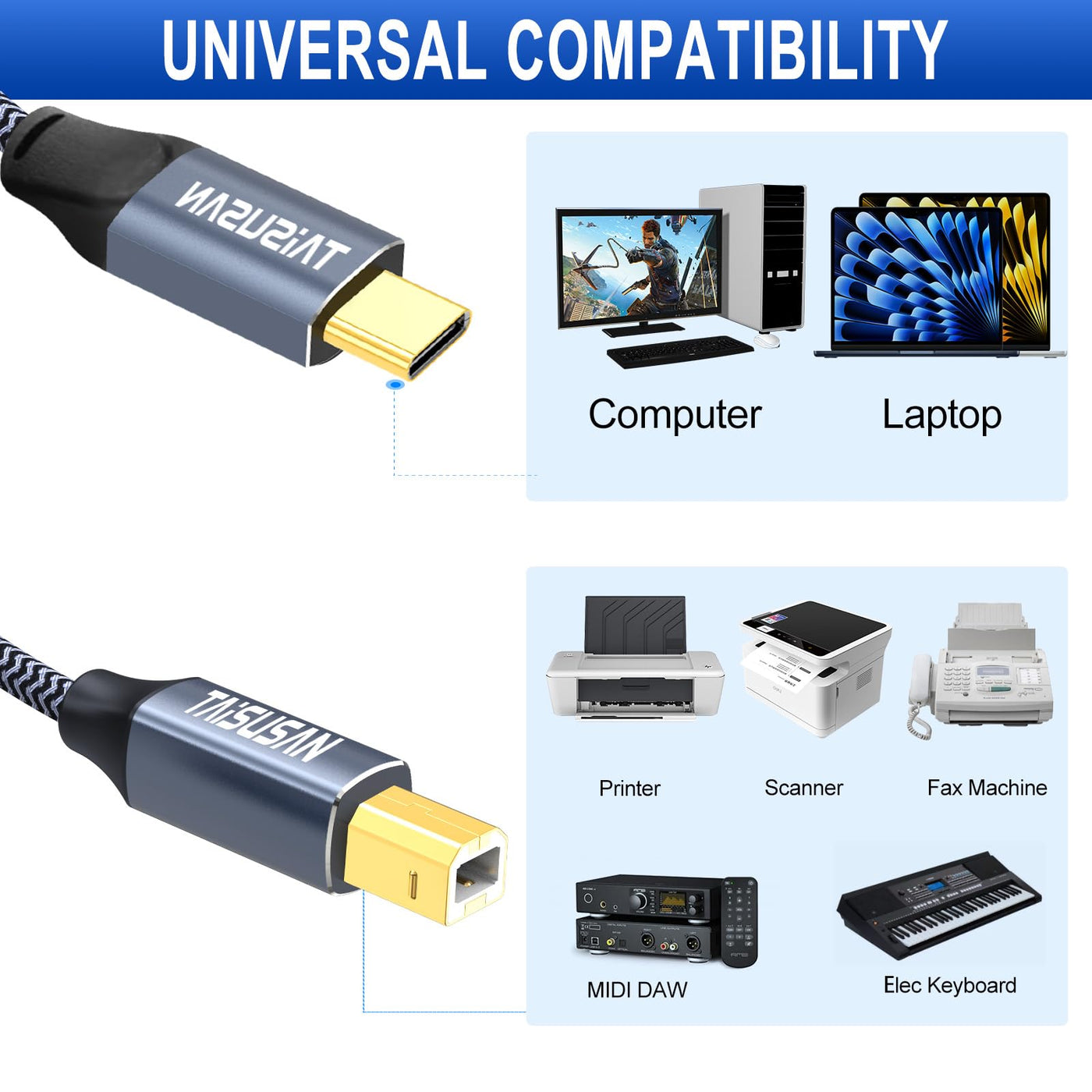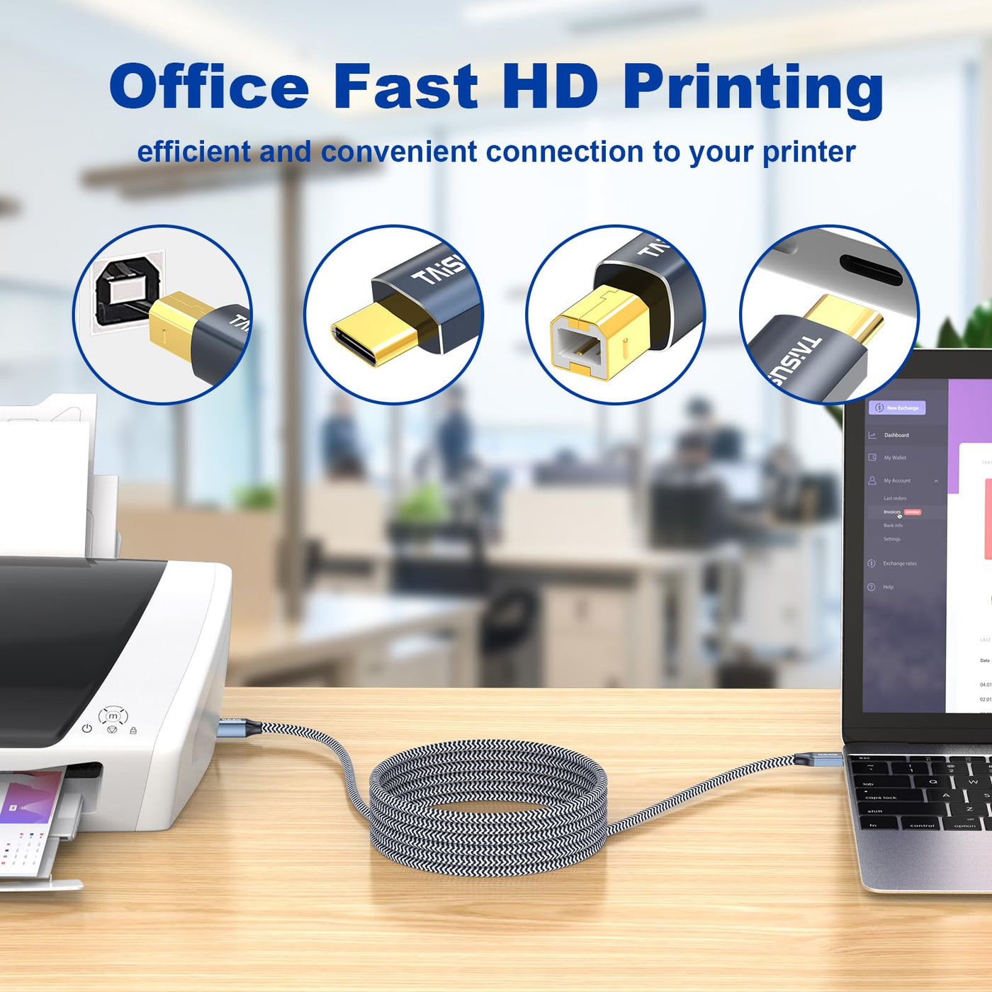 Taisusan Usb C Printer Cable Taisusan Usb B To Usb C Printer Cable Up To 480Mbps High-Speed Data Transfer & Backwards Compatibility, Its Superior Speed, Security And Stability Make It A More Reliable Option Than Most Wi-Fi Connections. This Usb C Printer Cable Is Ideal For Connecting Various Usb Type B Devices Such As Scanners, Printers, Electronic Keyboards And Pianos To Laptops, Computers (Mac/Windows Pc) And Other Usb-Enabled Devices For Data Transfer. Product Features ? Usb 2.0 Usb C To Usb B Printer Cable Can Transfer Data At A Maximum Speed Of 480 Mbps And Are Compatible With Usb 1.1 (12 Mbps) And Usb 1.0 (1.5 Mbps). ? Multiple Shielding Printer Cable: Visible Multilayer Shield Design, Signal Transmission Stronger And More Stable. ? Robust Design: Robust Pvc Jacket Make This Printer Cable More Durable, Flexible And Its With More Longer Service Life. ? Health And Environmental Pvc Material, Safe To Use. ? The Utilization Of Polished Gold-Plated Connectors Guarantees Dependable Connectivity, Corrosion Resistance, And The Eradication Of Signal Degradation And Noise Interference. ? Plug & Use: Simply Plug And Use, No Software Or Drivers Required. Compatible Devices: ? Deskjet Series/Officejet Series/Photosmart Series/Laser Printer; ? M Series/Lbp Seres Etc; ? Xp/Sx /Wf/Et Series; ? Mfc Series/ Dcp Series/ Mfc Series / Hl Series ; ? X /C / M Series; ? Clx Series /Ml Series; ? Ml /C / Mc Series; ? Other: Digital Piano, Sound Bar, Dac Etc... Important Notes: ? Ensure Your Device With A Type B Female Port; ? Not Compatible With Micro-Usb, Mini-Usb, Or Usb 3.0 Type B ? This Cord Is For Data Exchange Only, Not For Power.
