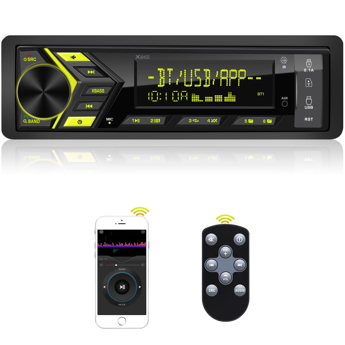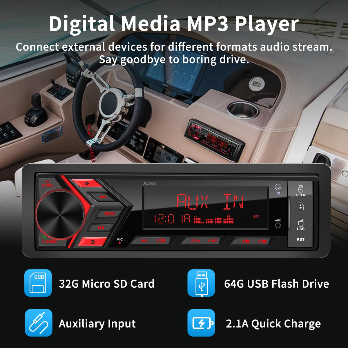 Single Din Digital Car Stereo Receiver - Bluetooth Marine Audio With Lcd Display | Mp3 Usb Micro Sd Aux-In | Fm Am Radio | 2.1A Fast Charging | App Remote The Marine Stereo Bluetooth Comes With Built-In Microphone, Which Lets You Get Clear Bluetooth Calls Without Distractions In Driving. This Single Din Bluetooth Car Radio Can Let You Play Phone S Spotify/Pandora Music. Just Enjoy A2Dp Music Streaming. The Boat Marine Stereo Supports Up To 64Gb Usb Flash Drive, 32Gb Micro Sd Card Readers And Auxiliary Audio Input. The Single Din Head Unit Is A Built-In Fm/Am Radio With 30 Stations Memory, You Can Search Radio Stations Manually Or Automatically. This Bluetooth Boat Audio Has Preset Customized Eq / Bass / Treble / Balance / Fader / Loud And Supports 300W Max Audio Output, Lets You Easily Immerse In Lossless Music. This 1Din Car System Supports 2.1A Usb Fast Charging. More Features: Id3 Tag Song Readout / Digital Lcd Display / 7-Color Physical Buttons / Power-Off Memory / Ir Remote / Rds Radio / Phone Control / Easy Setup