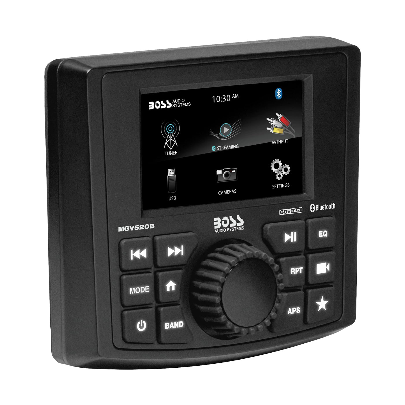 Mgv520B Marine Stereo W/Am/Fm/Bt/Usb/Rear Camerathe Boss Mgv520B Marine Stereo Gives You Impressive Sound And Marine-Rated Reliability. &Nbsp;This All-Weather Digital Media Receiver Features Built-In Bluetooth, So You Can Stream Your Favorite Tunes Without Taking Your Phone Out Of Your Pocket.This Rugged Receiver Packs A Lot Of Features Into A Compact Design That Fits Into A Standard Gauge Opening. Enjoy Your Favorite Am/Fm Radio Stations, Or Plug A Compatible Device Into The Rear Usb Or Aux Inputs. &Nbsp;The 3-Band Eq Lets You Optimize The Sound For Your Tunes, The Preamp Outputs Will Come In Handy When You Add Marine Amps And Subs To Your System. Also Included, A Rear Camera Input.The Color Led Display With Its Ipx6-Rated Water-Resistant Face Panel And Big, Easy-To-Use Controls Are Made To Resist Sun, Salt, And Moisture.Features:Gauge-Style Digital Media Receiver&Nbsp;3&Quot; Multicolor Screenipx6 Water-Resistance Ratingwaterproof Conformal-Coated Circuit Boardsrear Camera Inputtechnical Specifications:240 Watts Peak Powerdimensions (H/W/D) - 3.55&Quot; X 3.55&Quot; X 3.25&Quot;Chassis Type - Gauge Stylepresets - 18 Fm/12 Amin The Box:Mgv520B Stereo Head Unitmounting Hardwareowner'S Manual*Sold As An Individual