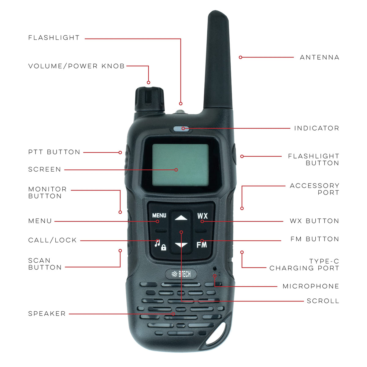 Frs Walkie Talkies With Dual Watch --- The Frs-A1 Are License Free Frs Walkie Talkies Programmed With All 22 Frs Channels Used By Frs Radios. All 22 Frs Channels Are Pre-Programmed And Able To Be Customized For Your Unique Application Needs. The Radios Support All 260 Dcs And Ctcss Privacy Tones (Up To 5720 Channel Combinations) Making Them Compatible With Any Other Frs Radio. The Frs-A1 Includes Dual Watch Capabilities Meaning, It Can Easily Monitor Two Different Channels. | Full Alpha-Numeric Display, Customizable, And Simple Operation -- The Frs-A1 Is Designed To Be Easily Customized. You Can Simply Rename Channels Instead Of Using Generic Channel Names Or Numbers. With The Full Alpha Numeric Display, There Is No Ambiguous Channel Numbers Or Guessing Going On - You Can Precisely Know Which Channel And Tone Is In Use. | Rugged And Versatile --- The Frs-A1 Is Ip54 Weather Resistant, Meaning It Can Reasonably Be Used In All Weather Situations. The Frs-A1 Can Be Charged Easily With Any Usb-C Cable . The Docking Station Can Also Charge Backup Batteries Without The Radios Present. The Frs-A1 Allows Quick Monitoring Of All Traffic On A Channel With The Monitor Key (No Matter What Privacy Tone Is In Use), And Also Includes A Built-In Flashlight And Built-In Fm Radio. | Long Range + Noaa Radio --- The Frs-A1 Uses The Maximum Allowed Power Output For All Frs Radios. Some Brands Advertise A 36 Mile Range Based On Power Output (2W), But In Real World Situations The Frs-A1 Will Transmit Up To 3-8 Miles In Unobstructed Terrain. The Frs-A1 Includes A Built-In Pre-Programmed Noaa Receiver And Is Able To Toggle To Hear Noaa Forecasts And Alerts. | Btech Is Proud To Be In The Usa, Which Allows You To Have The Best Available Local Support For Any Issue That May Arise. Btech Only Engineers And Develops Radio Products. This Brand Focus Allows You To Have The Best Available Radios And Accessories With The Most Features, With Real Usa Warranty And Support.