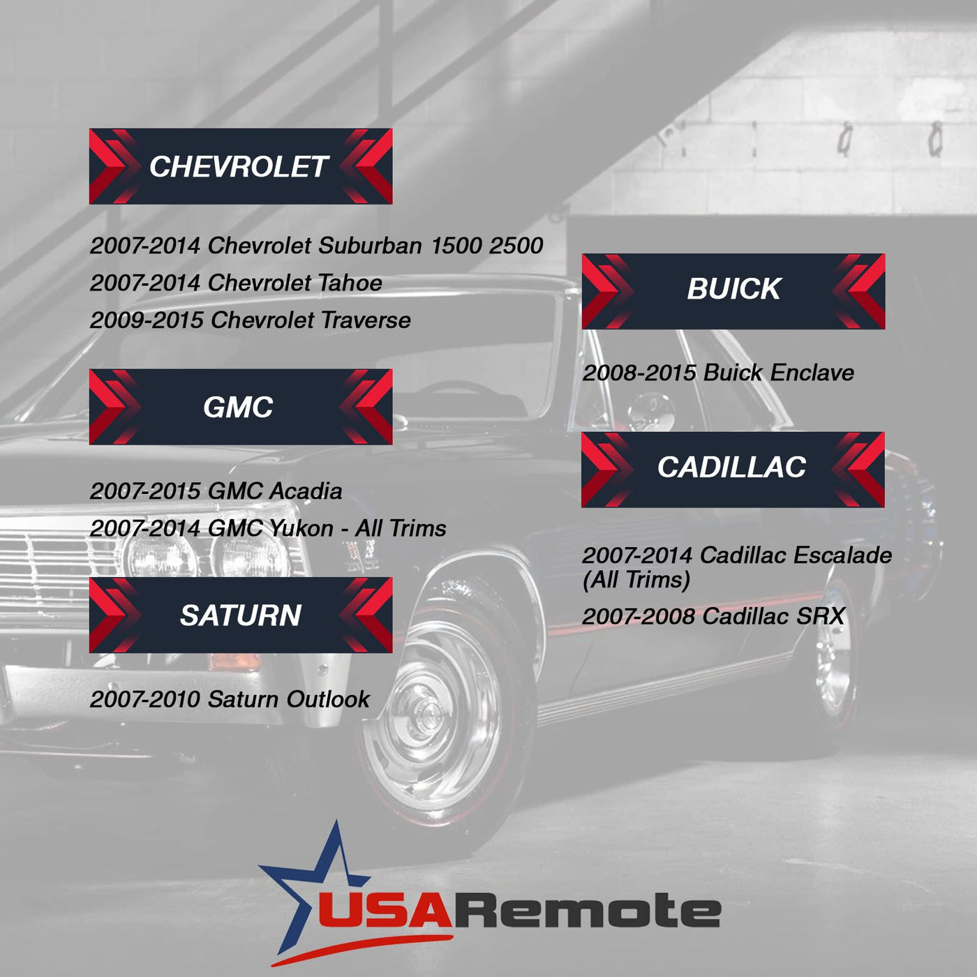Replace Your Lost Or Broken Keyless Entry Key Fob Remote With A Usaremote Fob. Fits P/N: Ouc60270, Ouc60221Buick:2008-2016 Enclavecadillac:2007-2014 Escalade (Includes Esv And Ext)2007-2009 Srxchevrolet:2007-2014 Suburban (Includes 1500 And 2500)2007-2014 Tahoe2009-2016 Traversegmc:2007-2016 Acadia2007-2014 Yukon (Includes Xl)Saturn:2007-2010 Outlookthis Is A Replacement Aftermarket Part.