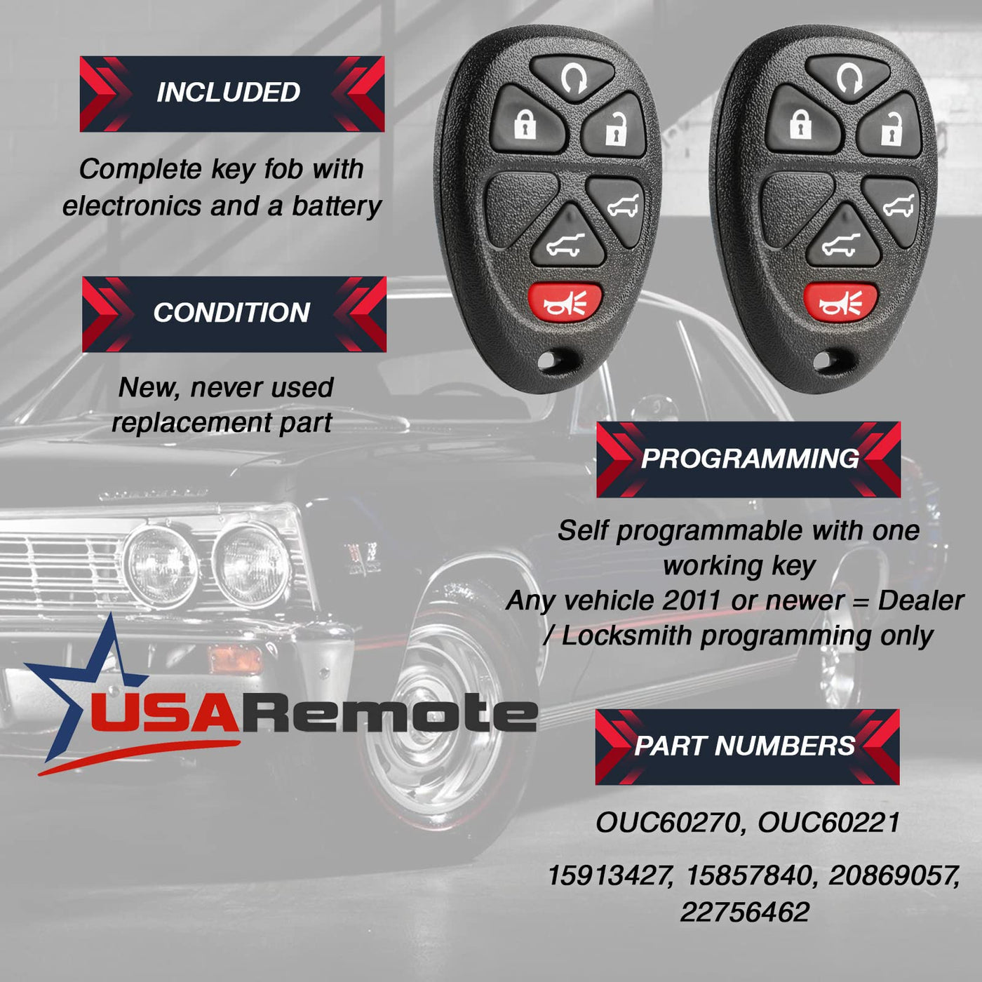 Replace Your Lost Or Broken Keyless Entry Key Fob Remote With A Usaremote Fob. Fits P/N: Ouc60270, Ouc60221Cadillac:2007-2014 Escalade (Includes Esv And Ext)Chevrolet:2007-2014 Suburban (Includes 1500 And 2500)2007-2014 Tahoe2009-2017 Traversegmc:2007-2014 Yukon (Includes 1500 And 2500)This Is A Replacement Aftermarket Part.