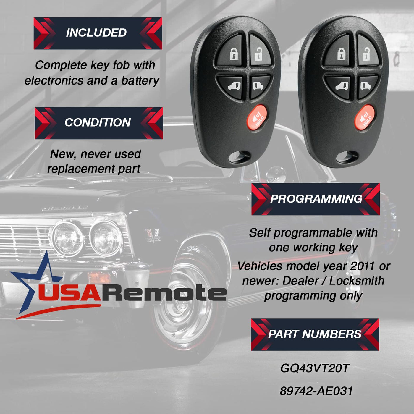 Replace Your Lost Or Broken Keyless Entry Key Fob Remote With A Usaremote Fob.Fits P/N: Gq43Vt20T2004 2005 2006 2007 2008 2009 2010 2011 2012 2013 2014 2015 2016 Toyota Siennathis Is A Replacement Aftermarket Part.