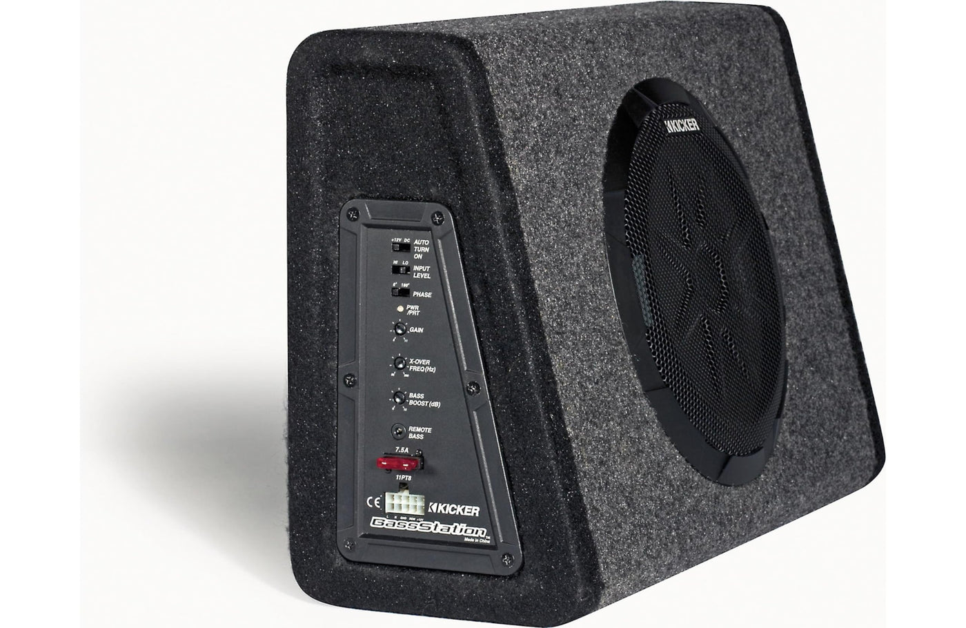 Kicker Has Developed And Perfected A Smart, Integrated Solution For Adding Legendary But Versatile Kicker Bass To Any Vehicles Audio System. Kicker Bassstation Powered Subwoofers Combine Subs, Enclosures And Amplifiers In A Specifically Designed Application For Optimal Bass Performance. With A Heavy-Duty Subwoofer, Tough Enclosure And Digital Amplifier Operating Together As One, The End Result Is Intense. Features A Quick-Connect Molex Power, Signal And Remote Turn-On Harness/Plug For Simple Set-Up Or Removal. Once Installed, Nylon Straps With Hook And Loop Help Secure The Bassstation In Place. When Hauling Space Is Needed, The Enclosure Is Simply Removed By Disconnecting The Plug And Loosening The Straps. The Bassstation Comes With A Remote Bass Control, Adjustable Low-Pass Crossover, Subsonic Filter, Variable +6Db Bass Boost, Phase Cancelling Switch For Max Bass Output And Two Automatic Turn-On Options. It Also Features High- And Low-Level Inputs For Integration With Nearly Any Factory Or Aftermarket Head Unit. Bassstation Specifications Woofer: 10 Rms Power [Watts], 14.4V: 100 Weight [Lbs, Kg]: 18, 8.2 Frequency Response [Hz]: 25-120 Crossover: 12Db/Octave Low Pass At 50-120Hz Subsonic Filter: 24Db/Octave High Pass At 25Hz Phase Switch: 0/180 Input Sensitivity: Low Level - 125Mv-5V, High Level - 250Mv-10V Kickeq Boost: Variable To +6Db @ 40Hz Remote Bass: Included Dimensions: Top Depth: 4-11/16 Height: 12-13/16 Width: 19-5/16 Bottom Depth: 7-11/16