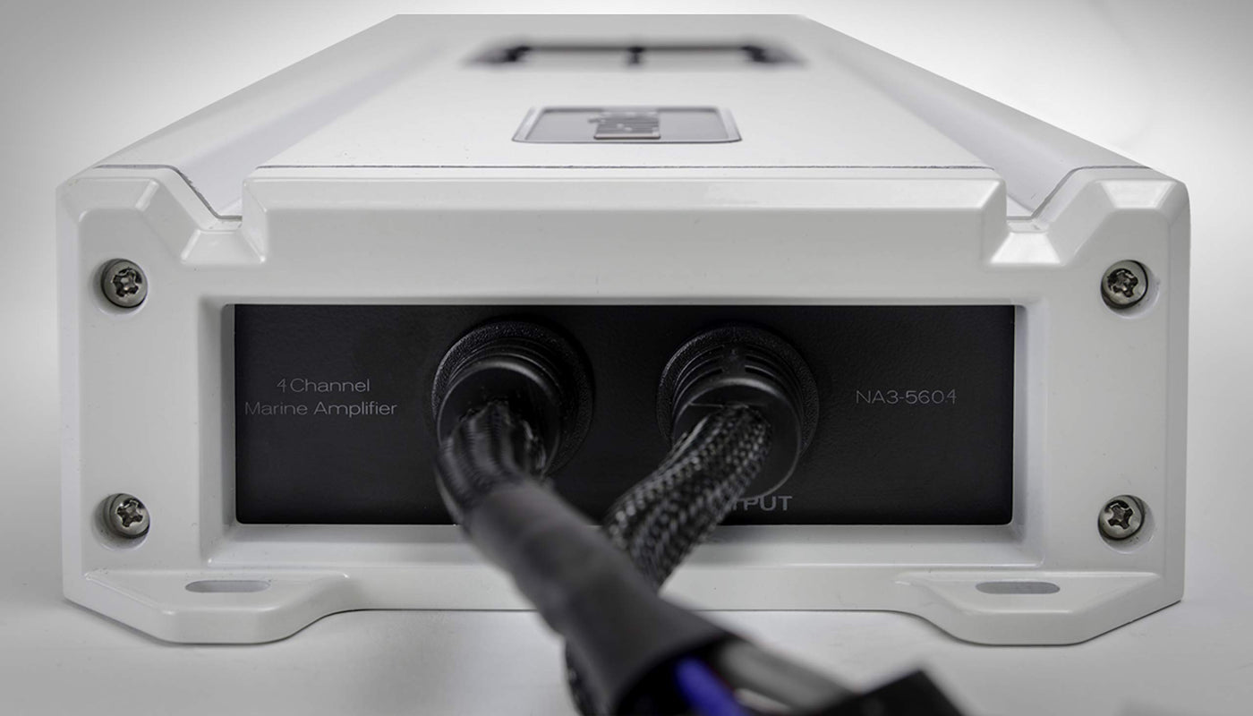 Four Channel Nautic Waterproof Amplifier With Marine Specific Connectors. Top Mounted Sound Contouring With Onboard Crossovers, Bass Boost And Adjustable Input Sensitivity All Concealed Behind Top Mounted Controls.
