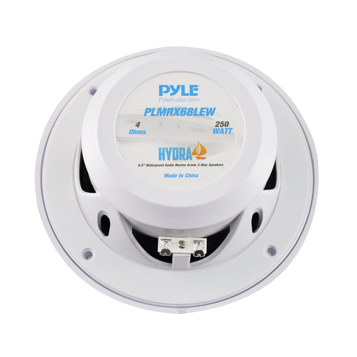 Pyle Model : Plmrx68Lew6.5 Inch Component Marine Led Speakers6.5 Waterproof Audio Marine Grade Dual Speakers With Built-In Programmable Multi-Color Led Lights, 250 Watt, Whitefeatures: Includes (2) Speakers Built-In Color-Changing Led Lights Programmable & Controllable Lighting Waterproof Construction Housing 2-Way Stereo Sound Polypropylene Cones With Cloth Surround Stain Resistant Grill Molded Abs Plastic Basket Includes Speaker Wiring & Mounting Hardware Used In Marine Vehicles Or Automobiles Perfect For Custom Installationstechnical Specs: Speaker Size: 6.5 -Each Power Handling: 250 Watts Peak Marine Grade Ip-44 Rating Tweeter: 1 Neodymium Dome Tweeter 4 Ohm Impedance Sensitivity: 93Db 8 Oz. Magnet Structure 1 Aluminum Voice Coil Frequency Response: 45Hz - 20Khz Led Output: 4A/Per Channel Power: Dc 12-24V Weight (Each Speaker): 1.45 Lbs.Color-Changing Led Lights: Dancing / Flashing Light Modes 20 Static Or 19 Dynamic Color Modes Speed & Color Brightness Adjustable 27 Built-In Multi-Color Led Lights Includes Remote Control & Lighting Console Controller Unitsize / Dimensions: Total Diameter: 7.6, Total Depth: 3.9 Cut-Out Diameter: 5.4 Mounting Depth: 2.6The Pyle Hydra Waterpoof 6.5 Speakers Feature Built-In Multi-Color Led Lights. Upgrade Your Audio By Adding An Exciting Visual Treat For Your Eyes As Well As Crisp Stereo Sounds For Your Ears. The System Features A Remote Control That Allows You To Program Your Lights -- Making Adjustments To Dancing, Flashing, Color, Brightness And Speed Modes. The Hydra Speakers Serve As Standard Oem Replacement Speakers For A Quick Swap And The Marine Grade Waterproof Construction Makes Them Perfect For Any Of Your Marine Vehicle Or Automobile Needs. Additional Features Include 2-Way Stereo Sound Reproduction, 250 Watt Power Output, Rugged Polypropylene Cones And Weather Resistant Abs Molded Baskets. Add Vivid Sound And Dynamic Color To Your Audio System With The Pyle Hydra Waterproof Speakers. (Available In Black And White, Models: Plmrx68Leb, Pmrx68Lew).