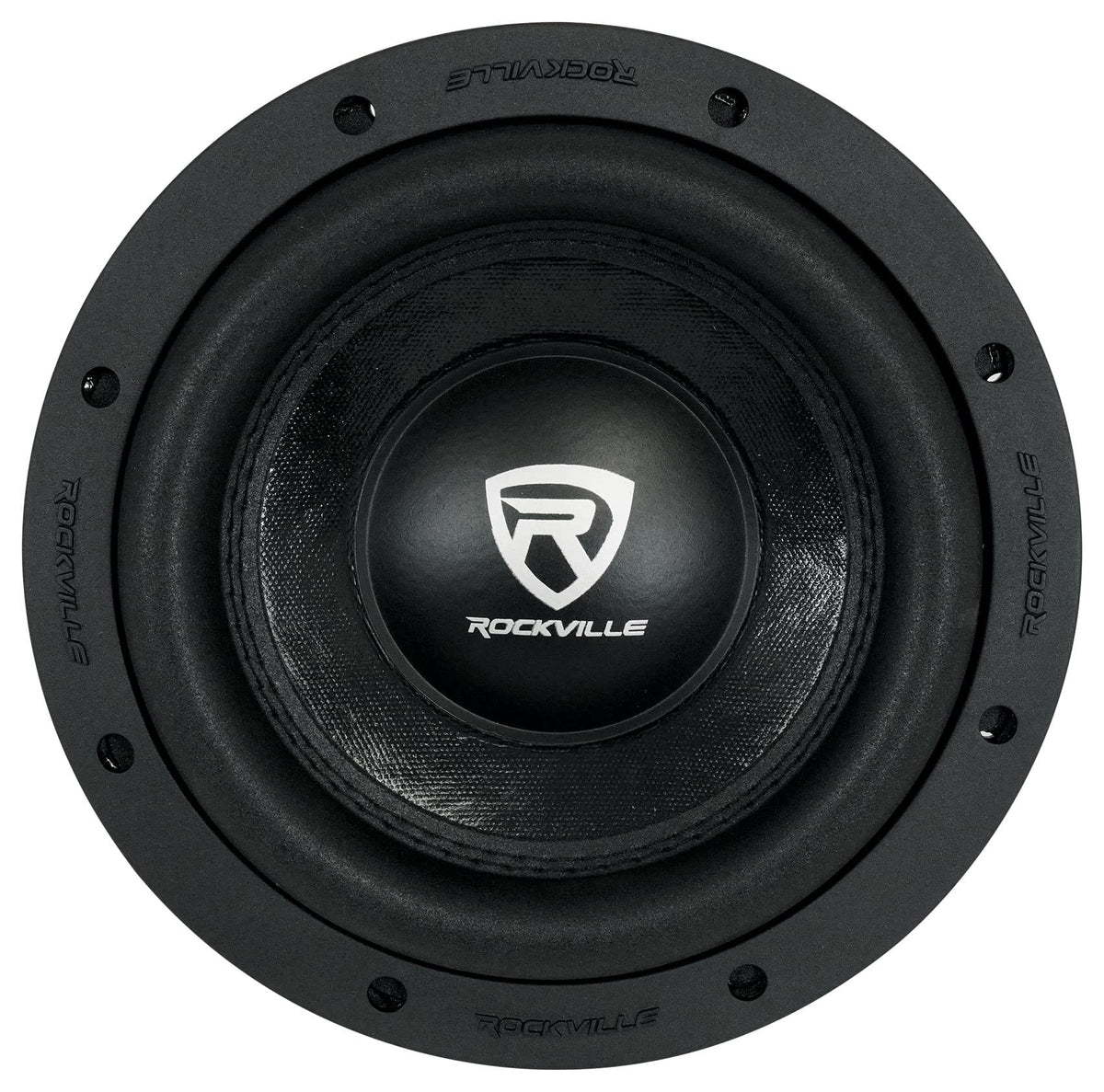 Rockville K6 Series 8 Dual 4-Ohm Car Subwoofer. | Peak Power Handling: 1400 Watts. Program Power Handling: 700 Watts. Rms Power Handling: 350 Watts. 2 4-Layer Voice Coils (Black Aluminum Former Wound With 100% Ofc Copper Wire). Double Stacked 70 Oz Magnet. Cast Aluminum Basket With Black Sanded Finish. Two Chrome-Plated Binding Post Terminals. Black Non-Pressed Paper Cone. | Ultra-Stiff Cone Is Extremely Thick And Strong. Thick Foam Surround Provides Incredible Sound Quality With Minimal Distortion. Black Stitching Reinforces The Cone And Ensures Long Life. Polypropylene (Pp) Dustcap. Impedance: Dual 4-Ohm Voice Coils. Vented Holes On T-Yoke Enhances Heat Dissipation. Custom Rubber Boot Magnet Cover. | Custom Rockville Mounting Gasket Makes It Easy To Mount The Subwoofer Air-Tight. High Bl Magnetic Motor Gap. 2 Layer Spider Made With Thick Gauge Material That Is Resistant To Tearing. Cutout Diameter: 7.79