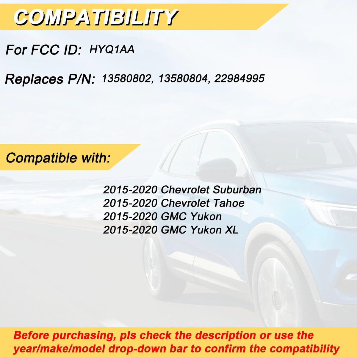 Specifications: Fcc Id: Hyq1Aa Replaces P/N: 13580802, 13580804, 22984995 Type: 6 Button Remote Frequency: 315 Mhz Battery: Cr2032 Emergency Insert Key, Same As: 22984995, 20765513, 5922084 Function: Lock, Unlock, Remote Engine Start, Power Door Release (Back Gate), Glass Hatch Release, Panic Alarm Condition:100% Brand New Material: Plastic + Metal Package Include: 2 X Keyless Entry Remote Key And Ring Loop Compatible With: 2015-2020 Chevrolet Suburban 2015-2020 Chevrolet Tahoe 2015-2020 Gmc Yukon 2015-2020 Gmc Yukon Xl Note: 1. Ensure That The Key Fob You Receive Looks Identical To Your Original Remote, As Any Variation May Lead To Compatibility Issues. 2. Diy Programming Is Available If You Have 2 Working Original Keys. If You Dont Have One, Its Necessary To Be Programmed By A Professional Dealer Or Locksmith. 3. The Key Fob Doesnt Support Push To Start Smart Key Systems 4. Please Note That The Key You Receive Will Not Have A Logo On The Back.