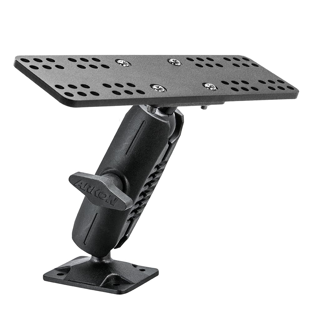 Attach Your Humminbird Or Kayak Fishfinder, Garmin Gps, Marine Radio, Or Other Marine Electronic Device To Your Boats Bow With Arkons Rmequip Universal Marine Electronic Mount. This Sturdy Mount Includes Arkons Apequip Mounting Plate With Robust Series 4-Hole Amps Mount. In Addition To Marine Electronics, You Can Attach Other Accessories To Rmequip, Including Batteries, Cb Radios, Ham Radios, And Audio Receivers. The Plate Can Also Be Used As A Splitter Plate. The Anodized Machined Aluminum Plate Measures 6.75 (17Mm) Long, 2 (50Mm) Wide, And 4Mm Thick. It Features 48 4Mm Unthreaded Holes That Are Spaced Apart To Provide A Number Of Mounting Options, Including Multiple 4-Hole Amps Devices. The Four 5Mm Holes In The Center Of The Plate Are Also Recessed In The 4-Hole Amps Pattern. The 4-Hole Amps Pattern Consists Of Four Holes Located In A Rectangular Pattern Spaced At 30.17Mm By 38.05Mm (Measured As The Center-To-Center Distance Between Holes). The Tough, Low-Vibration Mount Pedestal Measures Approximately 4.5 Inches High From The Bottom Of The Base To The Top Of The Pedestal (Holder Not Included), And Is Made Of A Combination Of Plastic And Glass Fiber. It Features An Amps Drill Mount Base. The Arm Of The Pedestal Swivels On Both The Top And The Bottom, Providing 360-Degree Rotation And The Ultimate Flexibility In Positioning The Device At Any Angle.