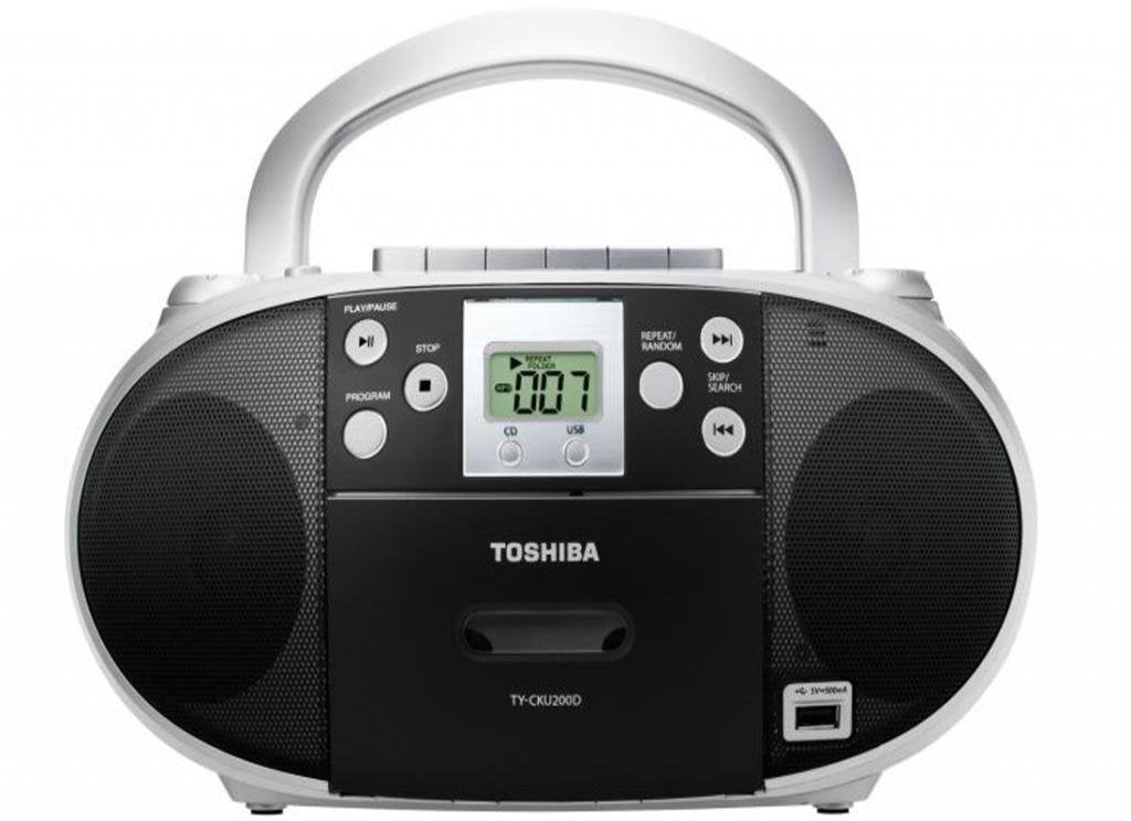 Toshiba's Portable CD/USB Radio Cassette Player/Recorder is a top loading CD player with a USB slot for MP3 and WMA playback. This player comes with a remote control. Top loading CD player USB slot for MP3/WMA playback MP3/WMA/CD-R/CD-RW playback AUX in/headphone terminal Remote control