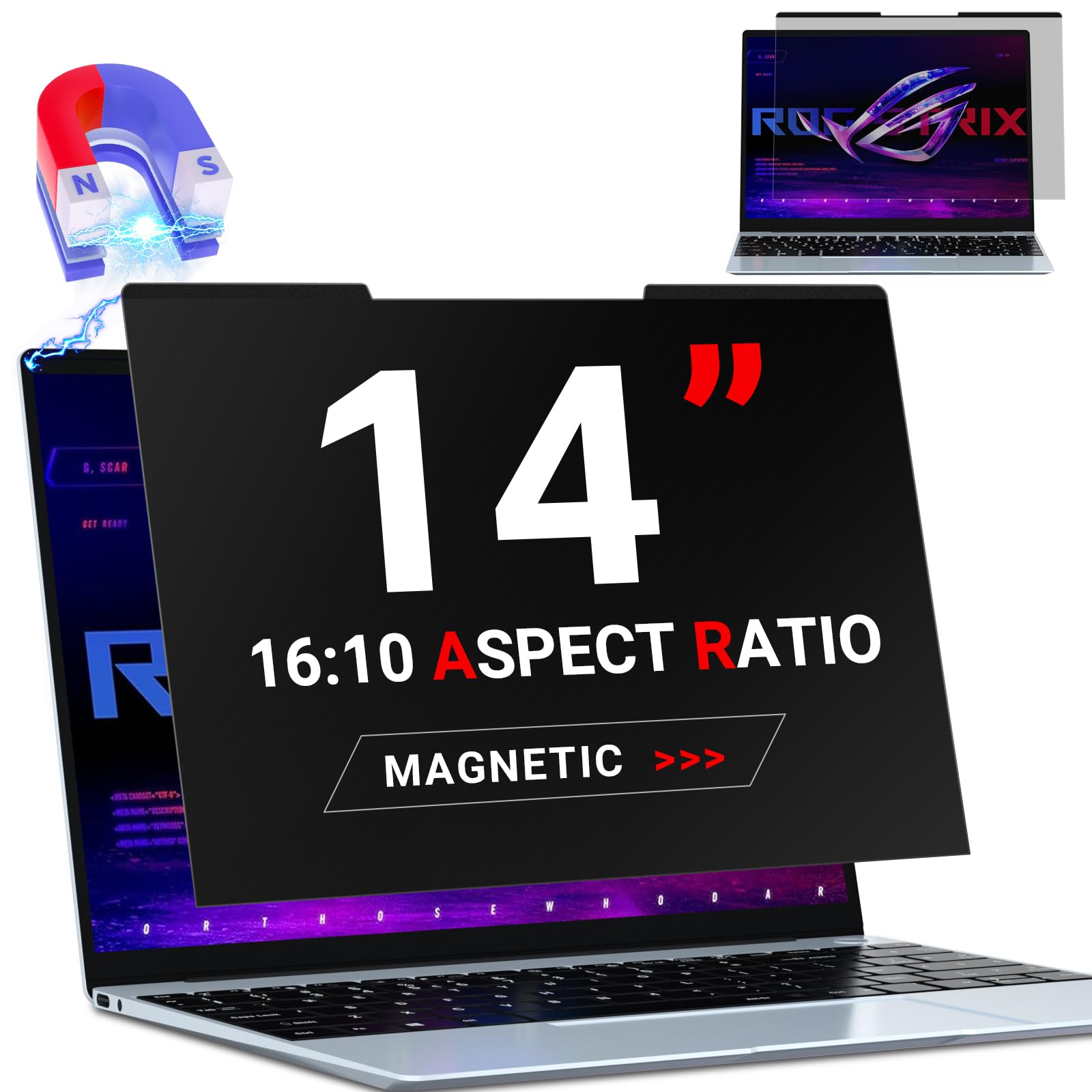 ?Compatible With 14 Inch 16:10 Aspect Computer?: 14 Inch Privacy Screen Aspect Ratio 16:10, Width: 11.89 Inches (302 Mm), Height: 7.4 Inches (188 Mm).(198 Mm [Contains 3 Mm High Magnetic Strips]). Zoegaa Privacy Film Laptop Magnetic Compatible With 14 Inch Hp, Lenovo, Dell, Acer, Asus, Samsung And Other Laptop Brands. Please Measure The Height And Width Of The Screen Before Buying The Laptop Privacy Screen 14 Inch (It Is Not Recommended To Choose Only On The Basis Of Diagonal Lines). ?2024 New Magnetic Suction Design Process?: 14 Inch Privacy Screen Adopts A Magnetic And Removable Design. For Laptops With Built-In Magnets, Simply Place The Laptop Privacy Screen 14 Inch Magnetic Near The Screen To Automatically Adsorb. For Laptops Without Built-In Magnets, We Provide One-Sided Adhesive Magnets So That The 14 Inch Privacy Screen Can Stick Magnetically To The Screen. Comes With A 14 Inch Privacy Screen Storage Clip. ?Easy To Install & Detachable?: Laptop Privacy Screen 14 Inch Magnetic Suction Design Process,Comes With A Screen Protector Storage Clip, Which Can Be Taken Off And Put Into The Storage Clip When Not In Use, And Stored In The Computer Bag Together With The Laptop. Anytime, Anywhere, Put It On And Take It Off, Everything Is So Easy! ?Unmatched Privacy?: The 14 Inch Privacy Screen Limits The Viewing Angle To 30, Provides A Clear View From The Front When Viewed From The Front And Not Visible From The Side. Laptop Privacy Screen 14 Inch Helps Maintain The Privacy Of Information On The Screen And Reduces The Chances Of Privacy Leakage. [It Does Not Block The View Directly Behind You, Regardless Of Distance.] Not Optimised For Touch Screens. ?Protect Your Privacy Anywhere?: 14 Inch Privacy Screen Perfect For Travel And Open Workspaces, Making It An Ideal Solution For Healthcare Providers, Mobile Workers, Commuters, Students, And Business Travelers. Safeguard Your Sensitive Information While Working In Airplanes, Coffe Shop, Airports, And Public Areas. ?Package Contents?: Magnetic Laptop Privacy Screen 14 Inch 16:10 X 1 Screen Cleaning Kit X 1 One-Sided Adhesive Magnet X 6