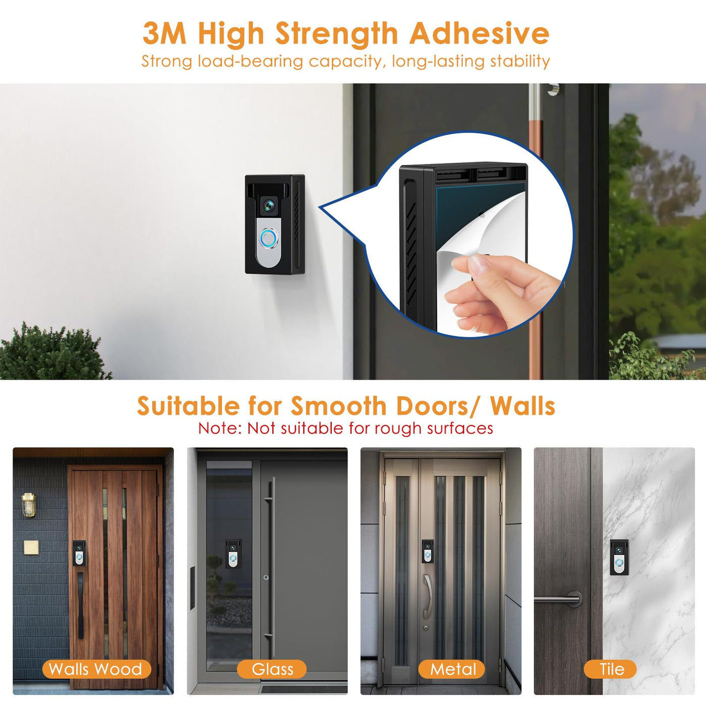 Q: What surfaces are best for mounting the QIBOX Video Doorbell Mount?A: The QIBOX mount is ideal for smooth surfaces such as metal, marble, glass, and wood. It is not recommended for use on brick or rough concrete surfaces, which may not provide a secure hold.