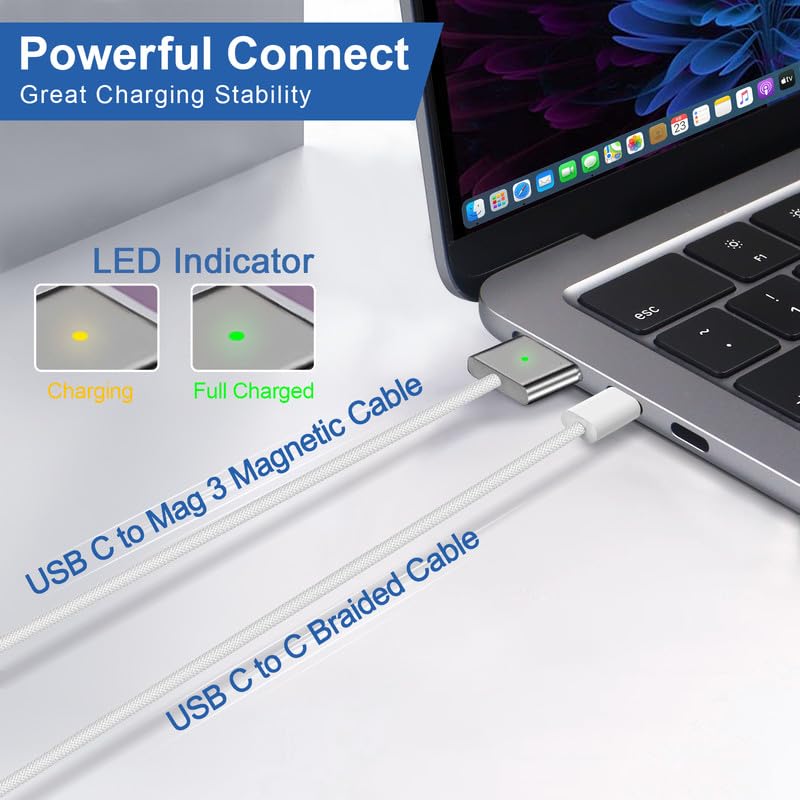 140W Usb-C Power Adapter Mac Book Charger For Mac Book Pro 14 16 Inch 2021 2023 M1 M2, Mac Book Air 13 15 Inch M2 M3 2022-2024, With 6.6 Ft Braided Magnetic Usb-C To Mag 3 Cable And Usb-C To C Cable Super Fast Charging Widely Compatible Superior Safety Protection Magnetic Connector Led Indicator Super Long Mac Book Charger Cord