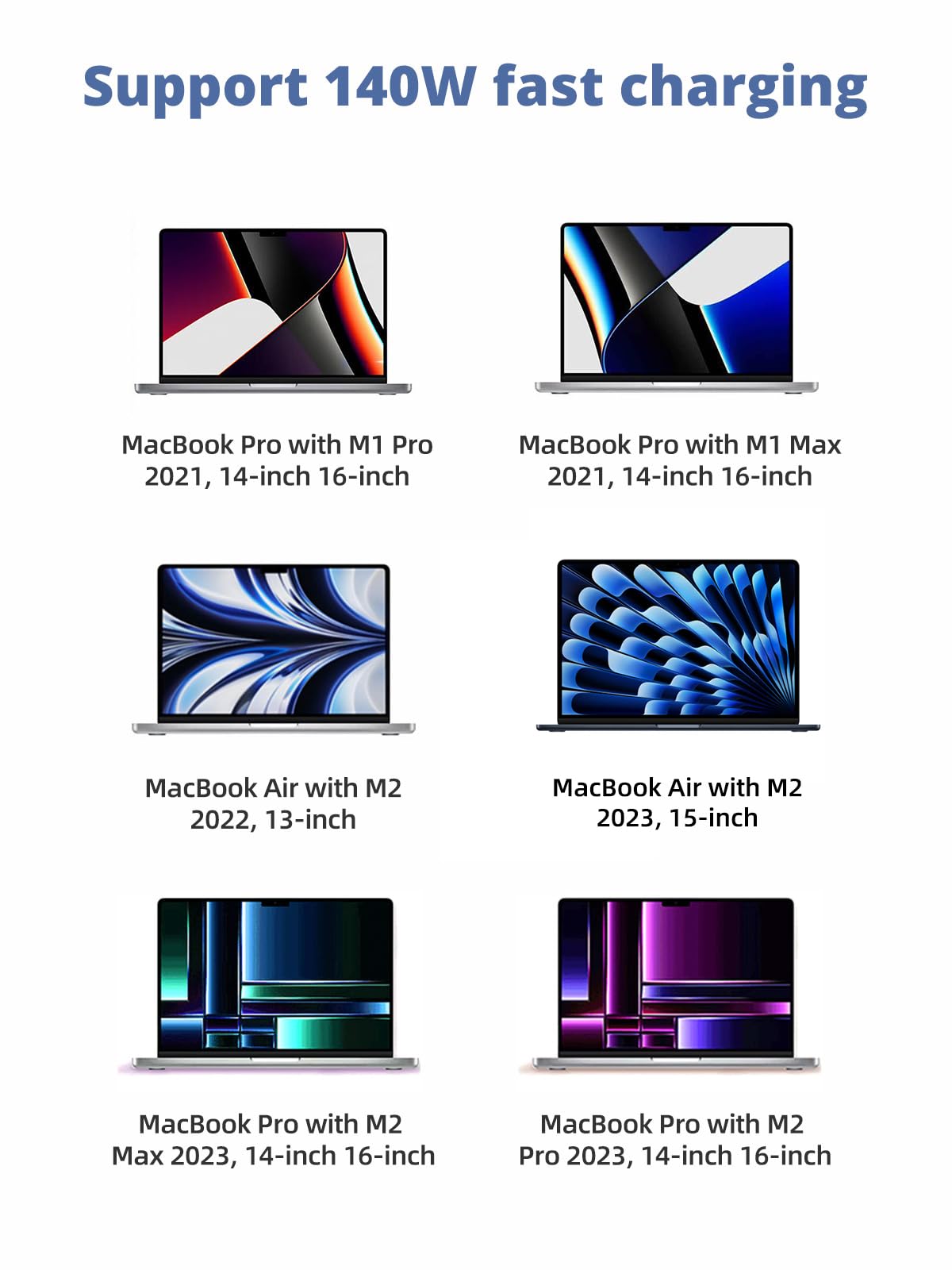 Q: What devices are compatible with the 140W USB-C to Magnetic 3-in-1 Cable?A: The 140W USB-C to Magnetic 3-in-1 Cable is compatible with MacBook Pro models featuring M1 Pro and M1 Max chips (2021), as well as MacBook Air models with M2 chips (2022 and 2023).