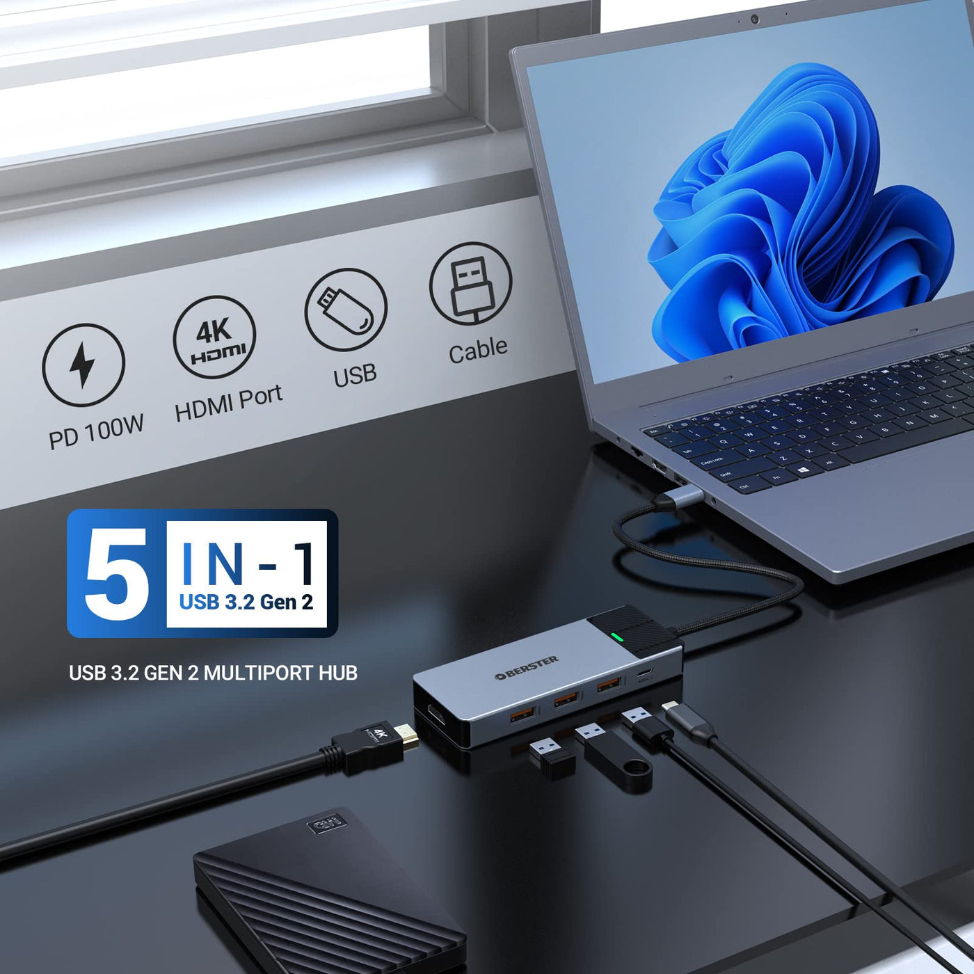 ?Versatile Multiport Usb-C 3.2 Hub?-- This Usb C 3.2 Hub Convert One Usb-C Port Into 3*Usb A 3.2 Gen 2 Ports, 1*4K@60Hz Hdmi Port, And 1*Pd 100W Charging Port For Connecting Peripherals. Simply Extend Your Laptop Or Tablet Which Lacks Ports And Once Plug In, It Can Work Without Additional Driver, Plug And Play For All Ports. | ?Comprehensive Use?-- Supports Usb C 3.2 Gen 2 Or Upper Level Host Port Device. This 5-Port Usb C Hub Is Universally Compatible With Macbook, Imac, Mac Pro/ Mini, Surface Pro, Xbox, Ps4, Notebook Pc. And The Usb A 3.2 Ports Also Apply To Various Desktop Electrical Appliances: Radiator, Pc Tower, Flash Drive, Keyboard, Mouse, Hdd, Printer. Any Problems Please Rest Assured To Contact Us, We Will Reply In 24 Hours. | ?Full Function Type-C Port?-- The Usb C Port On The Data Hub Support Both Data Transfering And Pd Charging. Convenient For Your Type C Device To Transfer Files Up To 10 Gbps. When Your Laptop Need To Be Charged, This Port Can Also Be Used As 100W Pd Port, Significantly Shortening Charging Times. The Built-In Smart Chip Of Usb C Extender Can Prevent Overload, Short Circuit, Overcharge, Overtemperature, Keeping Your Device Safe And Effectively Work. | ?4K Hdmi Usb-C Adapter?-- Mirror Or Extend The Screen Of Your Type-C Device With 4K Video At 60Hz Hdmi Output, Perfectly Synchronizes The Screen Up To High-Definition Tv, Monitor Or Projector, Delivering Immersive Clear High Quality Video Vibes. The Usb C To Hdmi Hub Very Suitable For Your Gaming Or Movie Night, Online Class, Meeting! | ?Advanced Usb C 3.2 Hub?-- By Using This Laptop Usb C Hub, You Can Glance Such Newest Technology Of Usb 3.2 Data Transfer Speed, 10 Gbps, 20X Faster Than Usb 2.0. Transfering An Hd Movie Under 2.5 Seconds. Please Mind When Using A High-Power Removable Hard Disk Or Solid-State Hard Disk, Please Connect The External Power Adapter Of The Hard Disk.