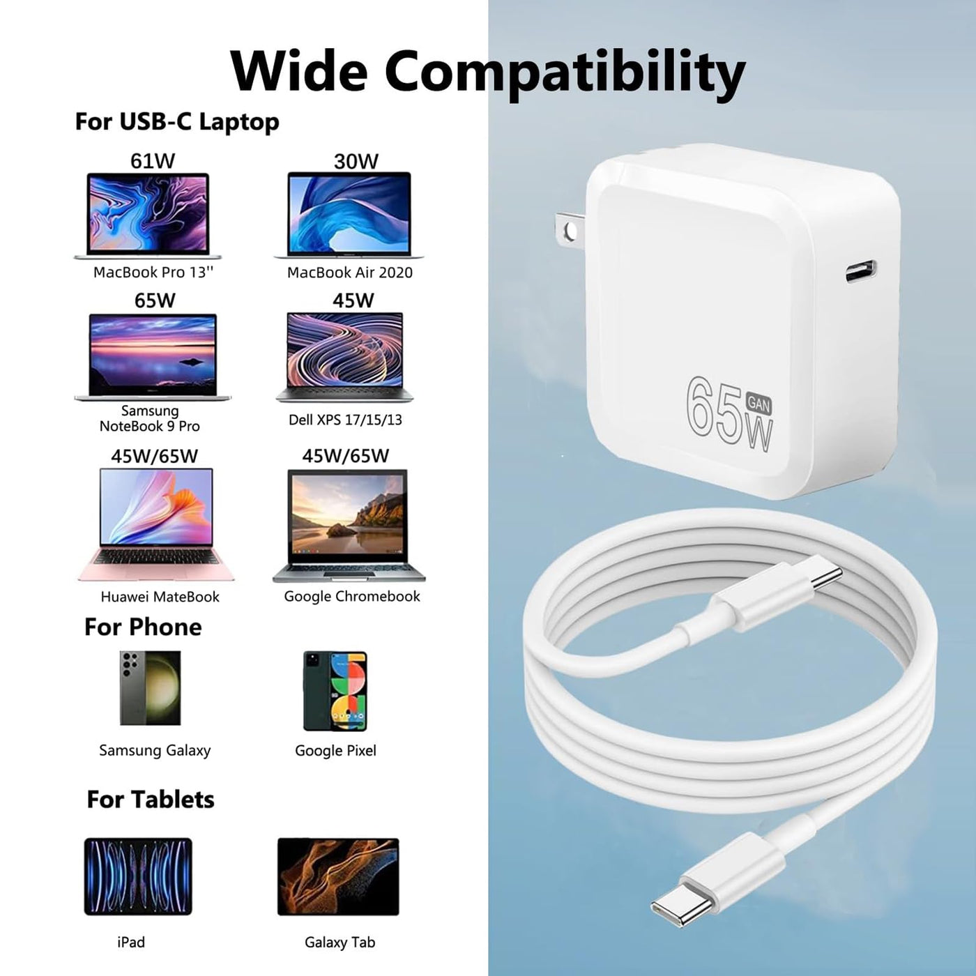 65W Usb C Charger - Fast Travel Laptop Charger Adapter For Mac Book Pro/Air,13,14,15,16 Inch, Dell Xps, Ipad, Iphone 14 Pro, Samsung Galaxy And All Usb C Type C Device 5.9 Ft Usb C To C Cable Included