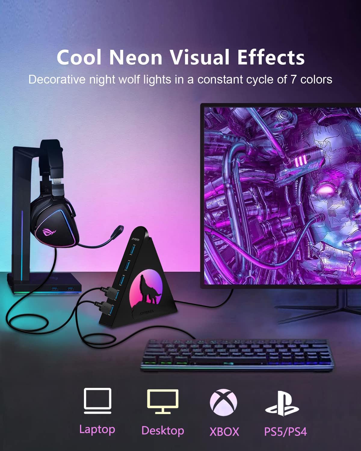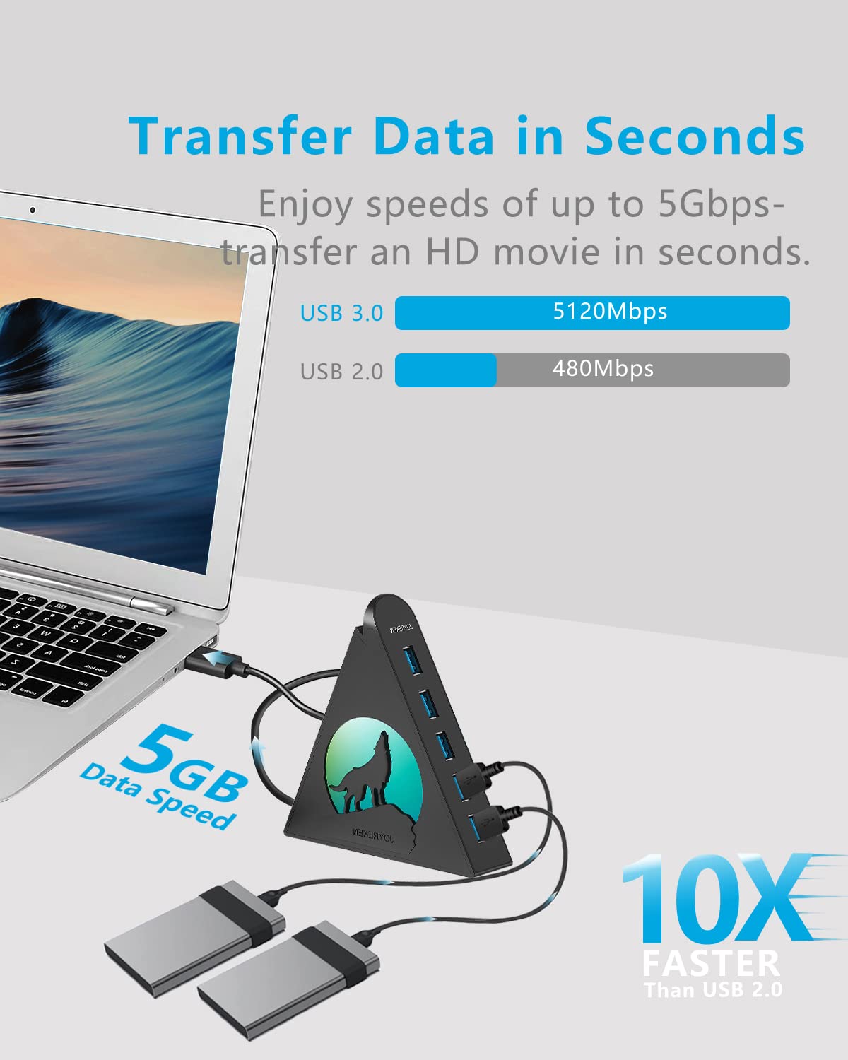 Note: Please Push The Button Once To Turn On/Off The Night Light On The Side. 7 Port Usb Hub: This 7-Port Usb 3.0 Data Hub Can Instantly Expand One Of Your Computer'S Usb Ports Into Seven External Usb 3.0 Data Ports For Keyboard, Mouse, Printer, Flash Drive, Thumb Drive, Hard Drivers And Other Usb Devices, Transforming A Single Usb Port Into A Full Work Station. (This Hub Is Not Designed To Charge Devices.) | Faster Speed With Usb 3.0: Seven Usb 3.0 Ports Supports An Impressive Data-Transfer Speed Of Up To 5 Gbps-10X Faster Than Usb 2.0 Hub(480 Mbps). That�S Fast Enough To Transfer A Full Hd Movie In Just Seconds! Get Synced Up In No Time. | Flexible 2 Ft Extended Cable: The Extended Cord Makes Hard-To-Access Usb Ports More Accessible, Ideal For Desktop Or Laptop Setups. With Two Full Feet Of Cable And Cable Tie, You Can Adjust The Length To Perfectly Suit Your Laptop Or Desktop Workstation By Positioning The Hub Anywhere The Cable Will Reach. | Uncompromised Visua: The Unique Howling Wolf Design On The Side And The Pyramid Design At The Top Provides An Aesthetically Pleasing Profile And Boundary-Breaking Visuals. Decorative Wolf-Shaped Night Light Can Continuously Cycle Through 7 Colors To Provides Soft Light And It Manages To Add Awesome Neon Excitement To Any Desk Space Whether At Home Or In The Workplace, Allowing You To Compliment Your Home Or Office Decor. | What You Get: Joyreken Howlinghub 7-Port Usb 3.0 Vertical Data Hub , User Manual, Our Worry-Free 12-Month Warranty And Friendly Customer Service.