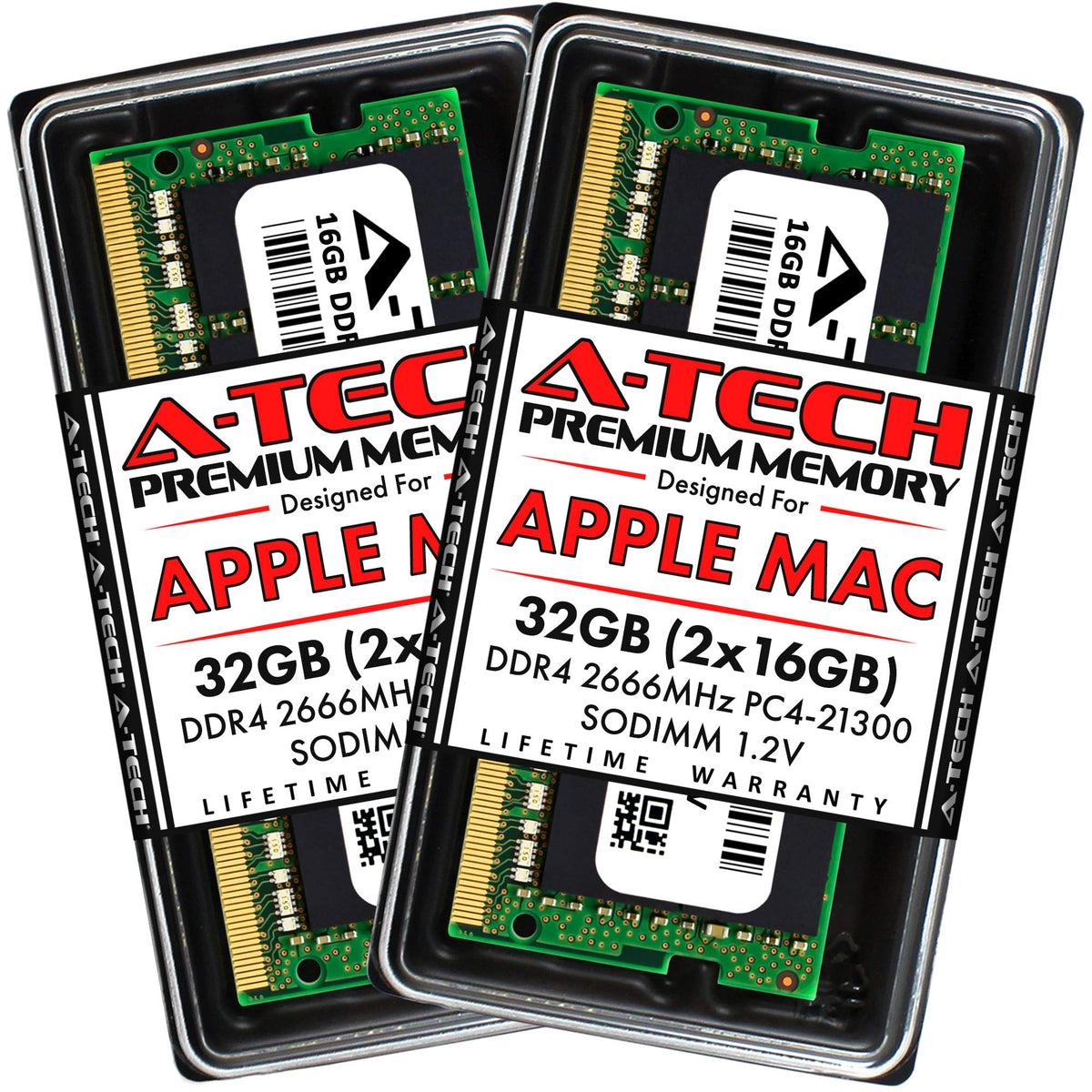 Q: What type of memory is the A-Tech 32GB RAM kit?A: The A-Tech 32GB RAM kit consists of DDR4 SO-DIMM memory, specifically designed for Apple iMac and Mac Mini systems. It operates at a speed of 2666 MHz and features non-ECC unbuffered technology.