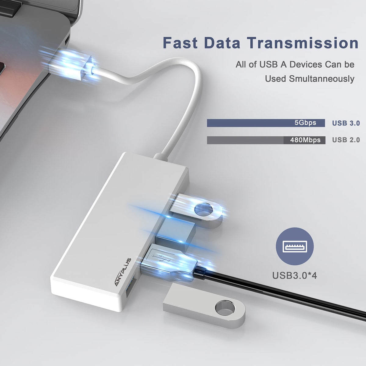 Anyplus 4-Port Usb 3.0 Hub The Usb Hub Helps You Expand Your Device Into 4 Usb-A Ports, Plug And Play, Convenient To Use, Fast And Safe Transmission, For You To Improve Work Efficiency And Convenient Life. 5Gbps High-Speed Data Transfer The Usb Splitter Supports Transfer Rates Up To 5Gbps And Is Compatible With Usb 2.0 (480Gbps), Usb 1.0 (12Mbps), And Has A Compact And Lightweight Design That Is Weightless So You Can Take It With You Wherever You Go. Note: The Usb Extender Was Originally Designed To Transfer Data And Cannot Charge Devices.Its Maximum Output Current Is 900Ma, In Order To Keep The Connection Stable, Please Avoid Connecting Devices With Total Current Over 900Ma. Package Includes: Usb 3.0 Hub X 1, Manual X 1
