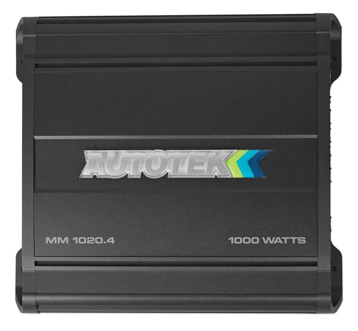 Q: What is the power output of the Autotek MM1020.4 amplifier?A: The Autotek MM1020.4 amplifier delivers impressive power with 500 watts mono bridged at 4 ohms, 125 watts per channel at 4 ohms, and 250 watts per channel at 2 ohms.